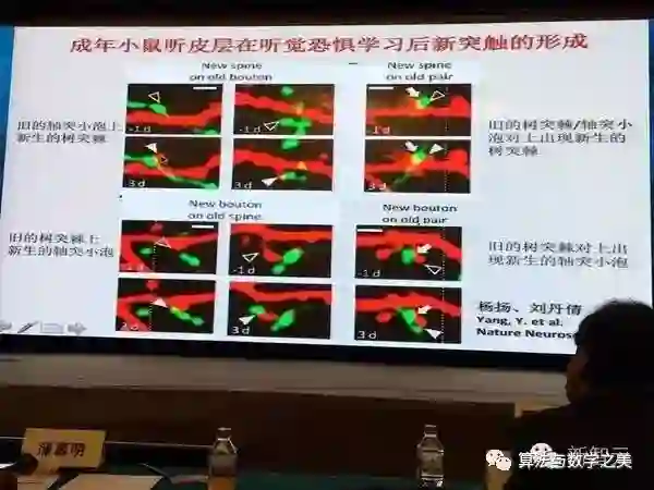 最近实验室发现,在小鼠活体进行学习的过程中,几天之内会产生新的突触。比如说这里我们看到突触前,我们标记了突触前的轴突跟突触后的树突,学习之后突然产生了一个新的树突棘,有了树突棘在那里,突然产生了一个新的突触前的小泡产生,也是一个新的轴突接触点,这种新的突触的产生在成年小鼠的大脑里面也在出现,但是这个出现的频率是远小于发育过程中的。