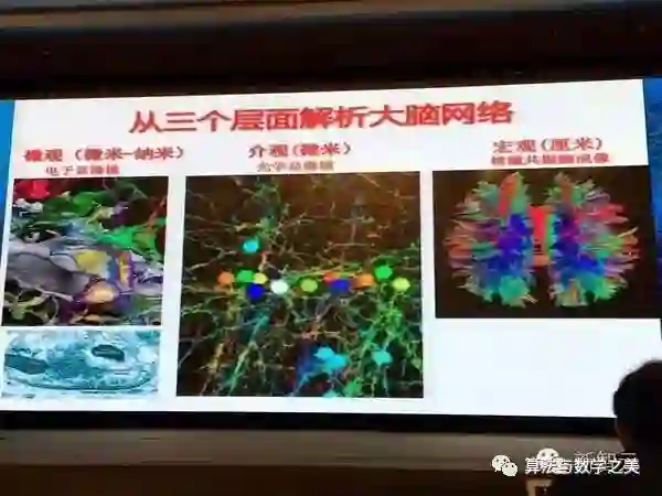 我们刚才看到的叫做介观层面。神经细胞种类很多,至少几百种,可能上千种,现在弄清楚小鼠的大脑里面有多少种细胞,还是脑科学的重大任务。每一种细胞反应不一样,功能不一样,所以要弄清介观层面不同的神经细胞网络是什么结构,用电子显微镜可以看到更多的微米到纳米阶段,看到细胞之间的连接,看到细胞之内的结构,看得更清楚、更复杂。现在最关键的还不是看微观,是看介观层面,从脑成像可以看到宏观的层面,很漂亮的连接图谱,这些图谱都是神经树,红黄蓝绿各种颜色的线,代表成千上万的神经轴突形成的神经树,不同细胞功能不一样,光有宏观的是搞不清楚大脑结构的。