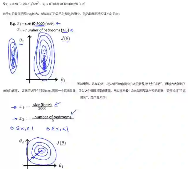 让特征们的取值处于同一个范围里面,可以加快梯度下降法的收敛速度。原因在下图中形象说明了。