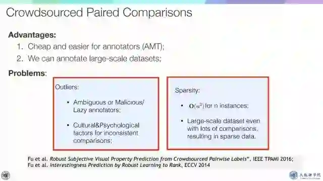 对于这类数据,我们一般是要做Crowdsourced Paired Comparisons来收集它的标注信息,这里的优势在于,标注起来更节省成本,可以标注大规模的数据集。这里有个问题,一个是outliers,另一个是sparsity,因为毕竟是一个稀疏空间。