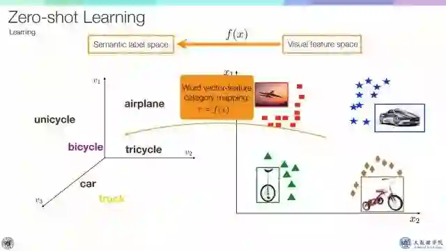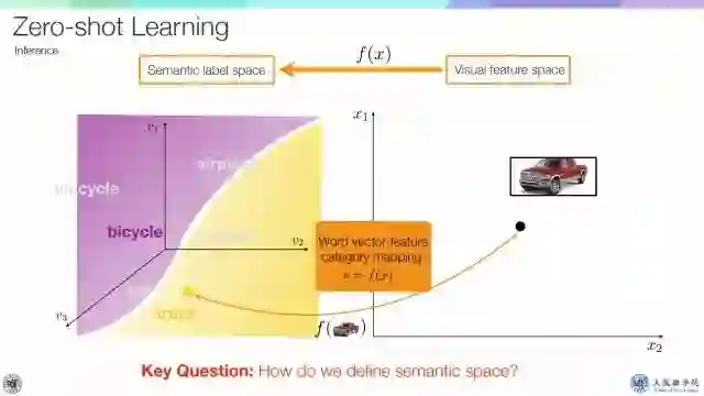 Zero-shot learning是为了识别未知类别的样本,其思想是迁移一些已知的辅助类别语义知识。如图黑色字体标签就是辅助类别,我们可以根据已知的辅助类别样本来学习从视觉空间到语义标签的映射,所有测试样本都会被投影到该语义空间,然后被赋予相应的标签信息,这里的关键是如何选取语义标签。