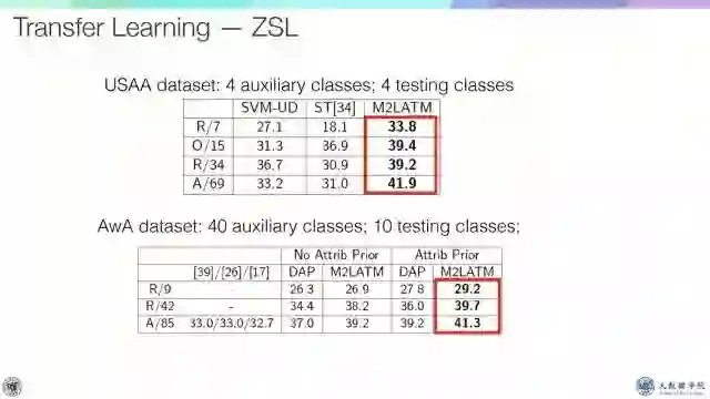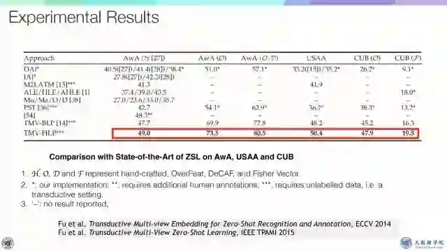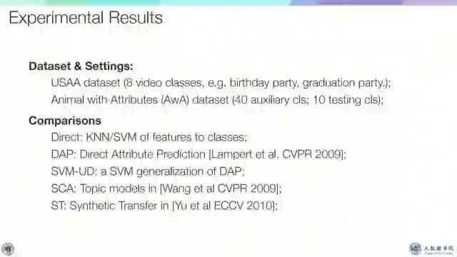 在三个标准测试集上的结果显示效果非常好,尤其是AwA,这是2014年的结果,AwA的结果已经能达到80.5。