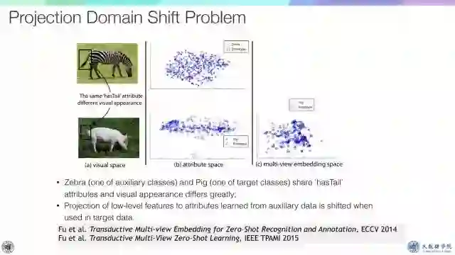 在零样本学习中,有两个问题。第一个是projection domain shift问题,比如,斑马和猪,斑马是辅助训练数据,而猪是目标数据,它们都有hasTail这个属性,但是它们的视觉属性是非常不一样的,把从辅助数据中学习到的浅层特征直接映射到未知数据上,一定会出现domain shift的问题,而这个domain shift其实是一个多维问题,我们称之为projection domain shift问题。