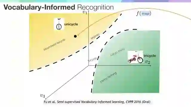 另一方面我们可以利用free-vovabulary词汇来帮助整个学习过程,比如图像被映射到语义空间,在这个空间中,只知道unicycle或tricycle,在零样本学习情况下,我们更倾向于把它归为unicycle,因为它靠近unicycle的语义原型。