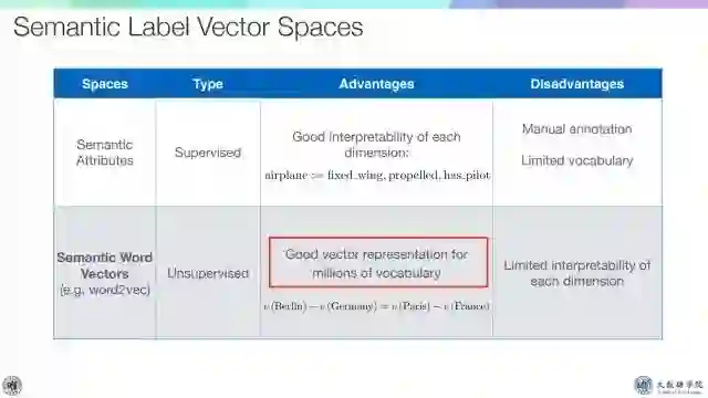 如图所示,一般的语义标签大体上可以分为两类,一类是Semantic Attributes(语义属性),它具有很好的解释性但需要大量的人工标注,而另一类是Semantic Word Vectors(语义向量),可以从大量文本中训练出来,并不需要人工标注,并有大量的free vocabulary。
