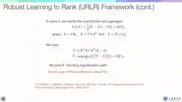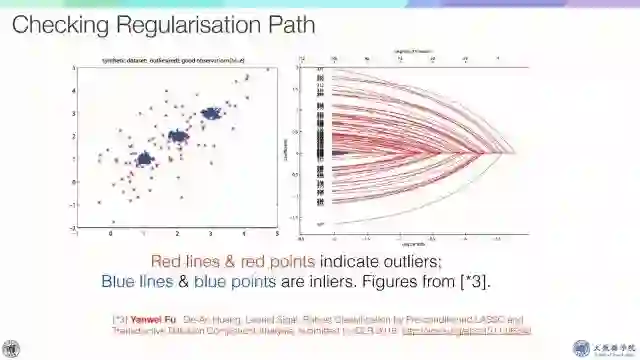 我们的解法是用Regularisation Path,左边蓝色点对应inline,红色点对应outline,如果check regularisation path会发现,从右到左变换拉姆达值的时候,outline会首先出现,所以就可以对所有这些点进行排序,然后top就是outline。