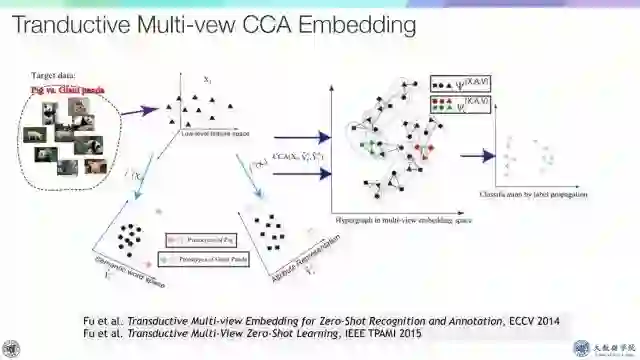 基于这三个问题,我们提出了一个算法框架。假设在目标数据上可以得到不同的子空间,每一个空间代表每一个view,利用一个multi-view CCA把数据投影到CCA space,在这个空间里面构造一个graph或者hyper graph,然后进行ranking,这样就可以做one-shot learning,zero-shot learning,甚至open set learning。