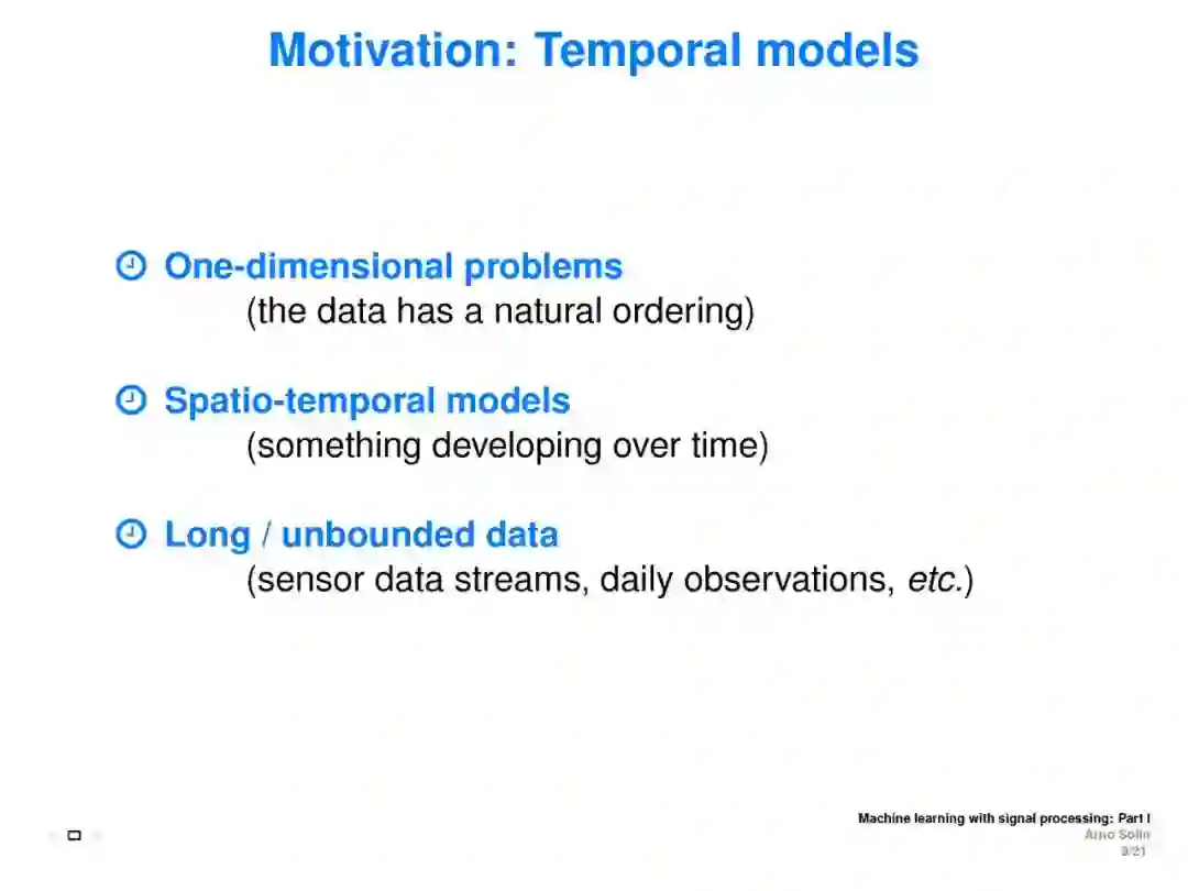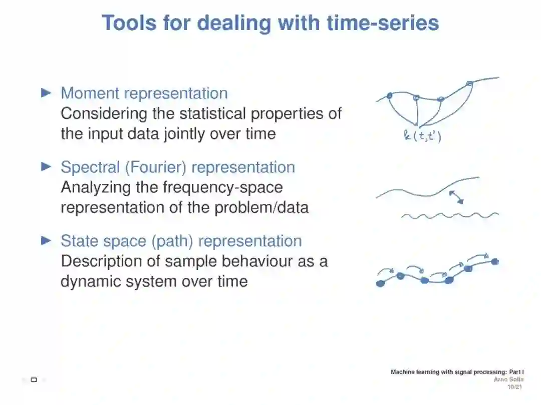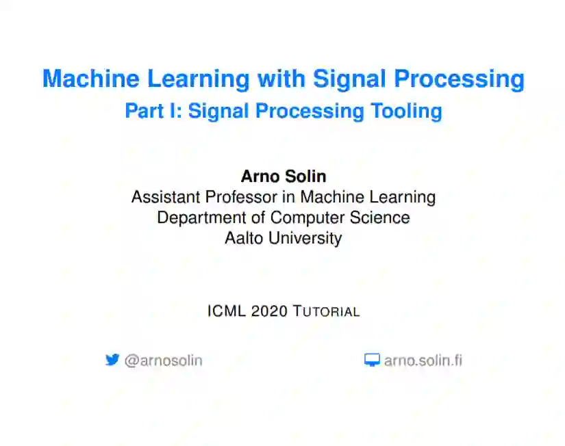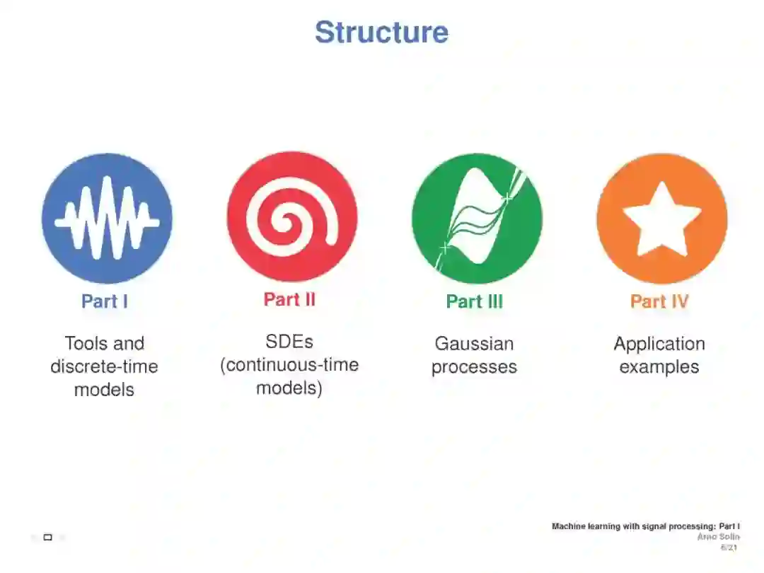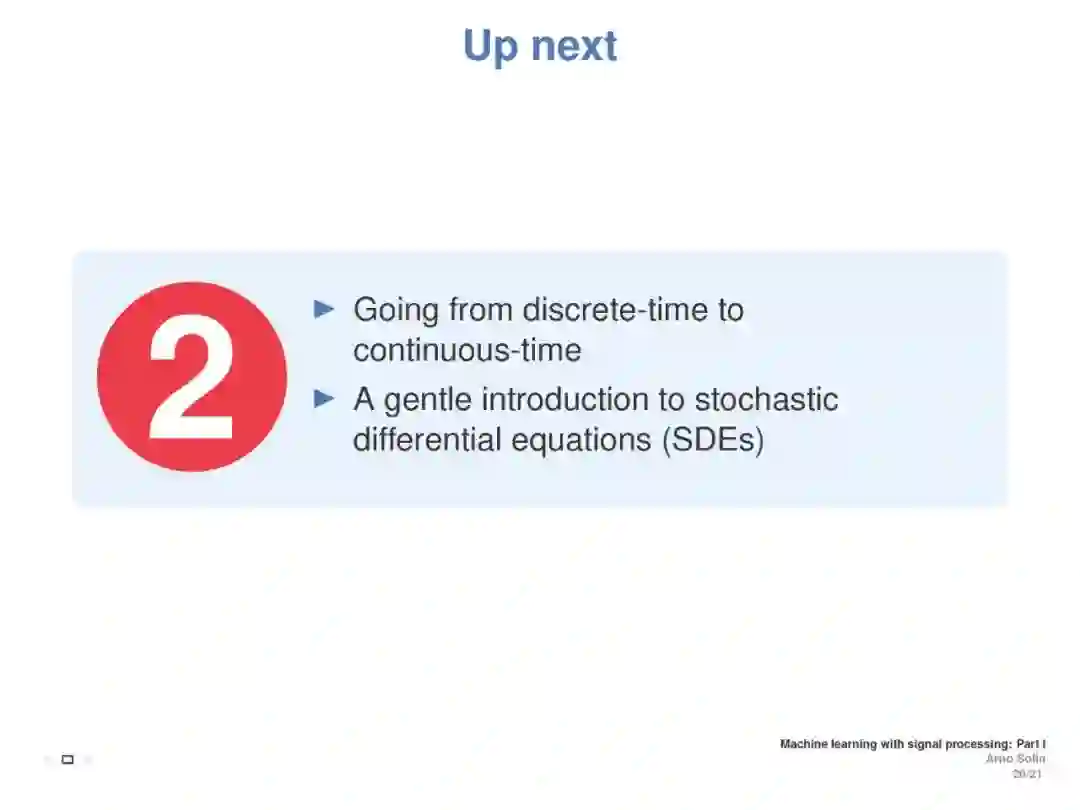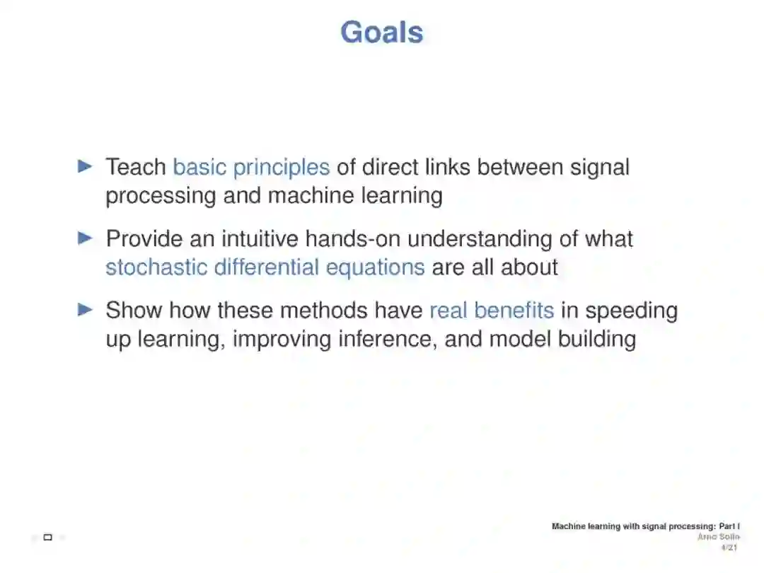 本教程旨在涵盖与离散时间和连续时间信号处理方法相联系的机器学习方面。重点介绍了随机微分方程(SDEs)、状态空间模型和高斯过程模型的递推估计(贝叶斯滤波和平滑)。目标是介绍基本原则之间的直接联系信号处理和机器学习, (2) 提供一个直观的实践理解随机微分方程都是关于什么, (3) 展示了这些方法在加速学习的真正好处,提高推理,模型建立,演示和实际应用例子。这将展示ML如何利用现有理论来改进和加速研究,并为从事这些方法交叉工作的ICML社区成员提供统一的概述。