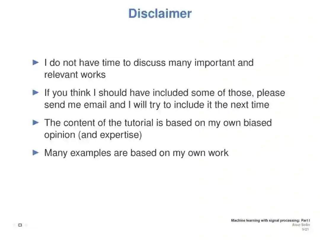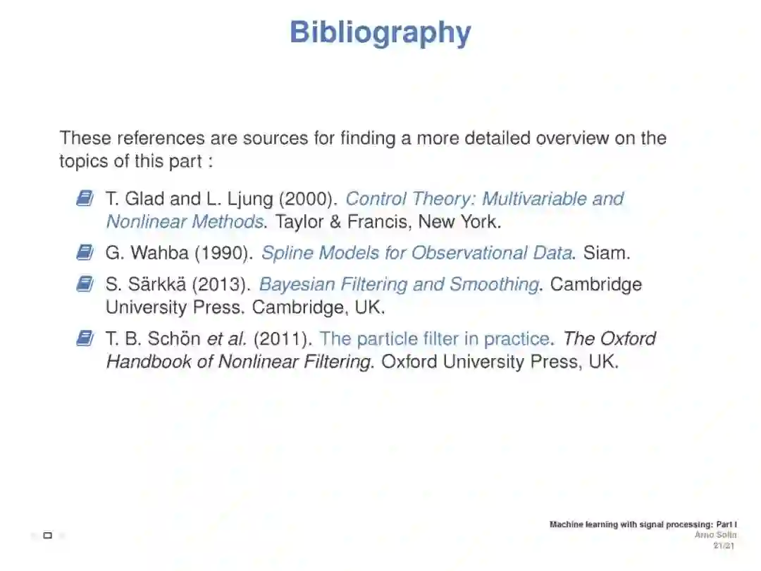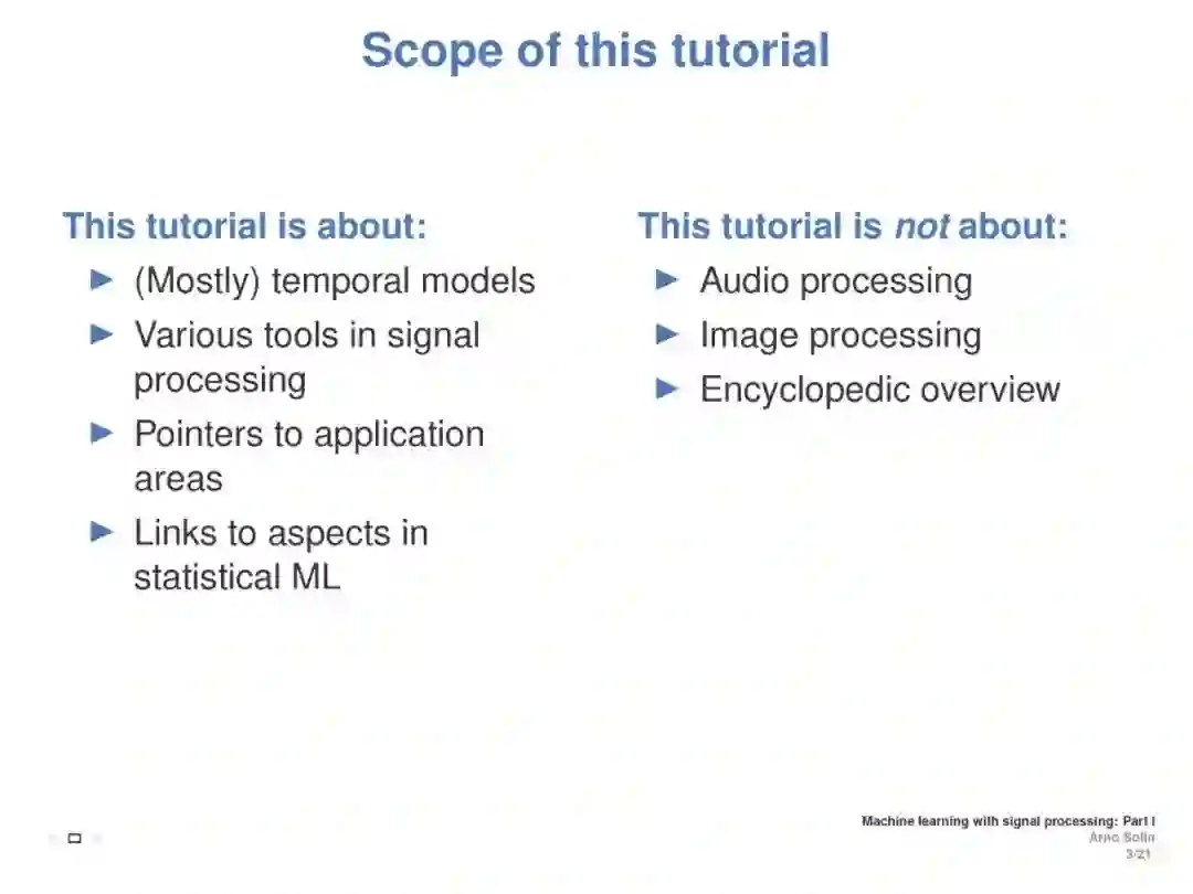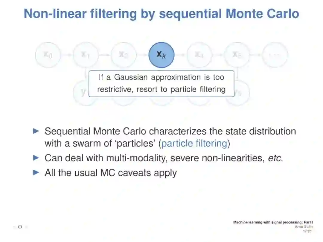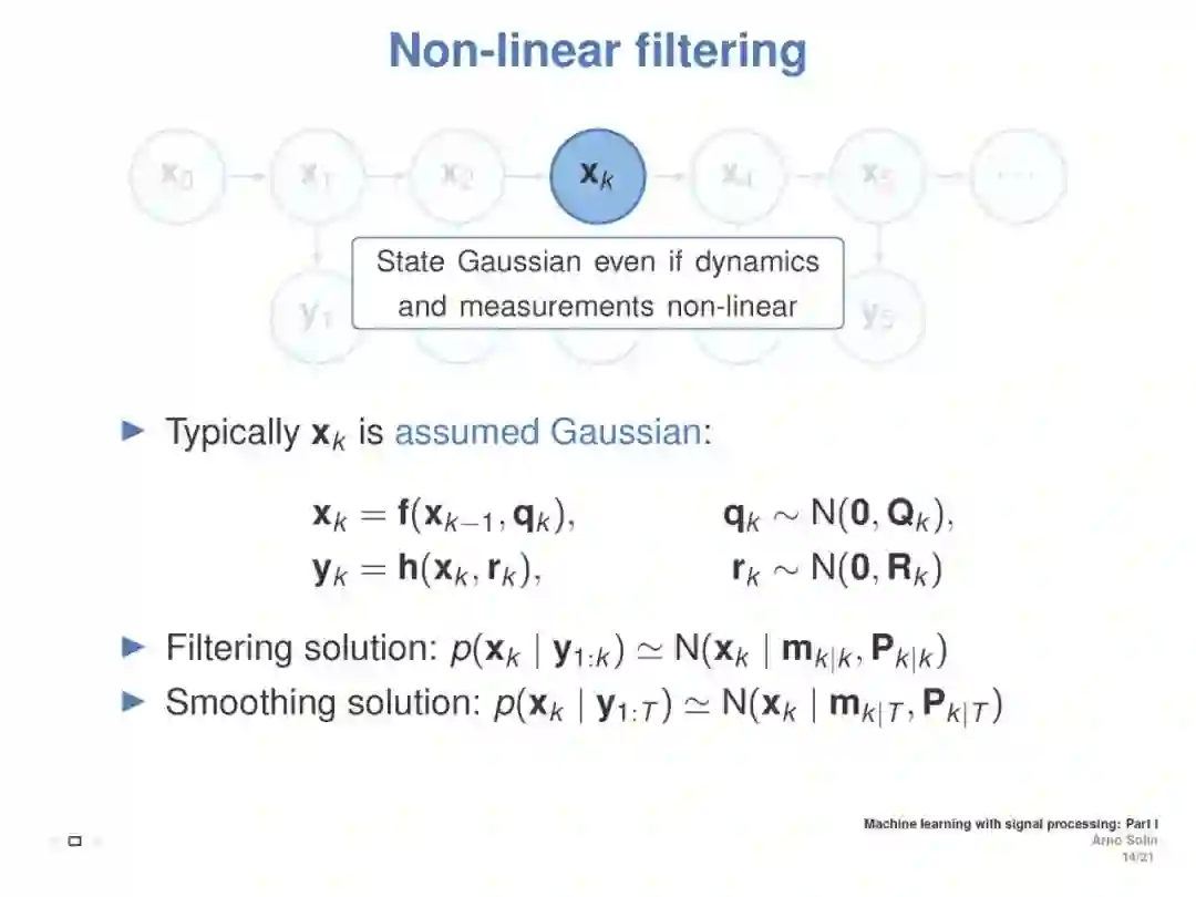 本教程旨在涵盖与离散时间和连续时间信号处理方法相联系的机器学习方面。重点介绍了随机微分方程(SDEs)、状态空间模型和高斯过程模型的递推估计(贝叶斯滤波和平滑)。目标是介绍基本原则之间的直接联系信号处理和机器学习, (2) 提供一个直观的实践理解随机微分方程都是关于什么, (3) 展示了这些方法在加速学习的真正好处,提高推理,模型建立,演示和实际应用例子。这将展示ML如何利用现有理论来改进和加速研究,并为从事这些方法交叉工作的ICML社区成员提供统一的概述。