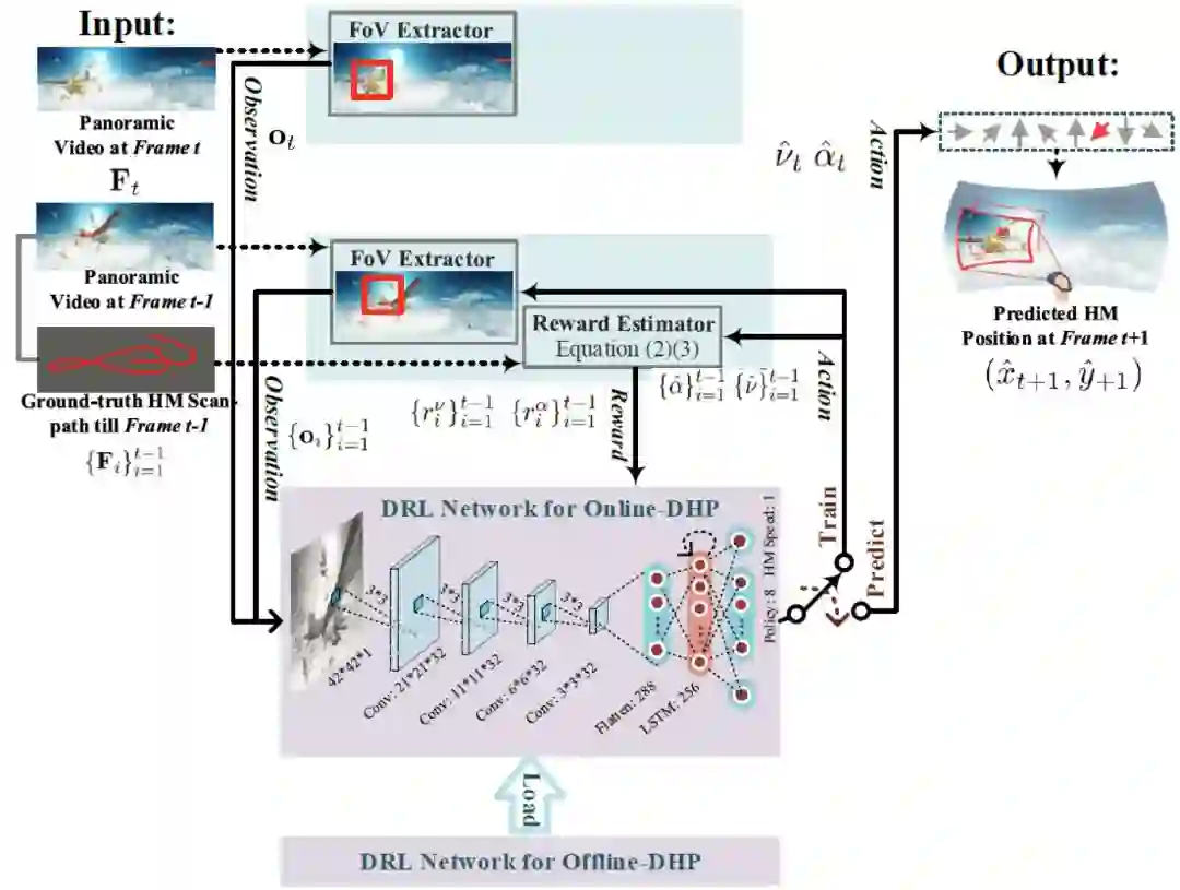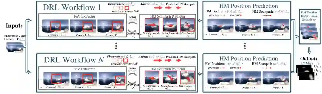 在离线-DHP 中,论文运行多个 DRL 工作流以确定每帧可能的 HM 位置。然后,生成热点图作为 offline-DHP 的预测输出。在在线-DHP 中,论文给定当前观察到的 HM 位置,来估计被试者的下一个 HM 位置。