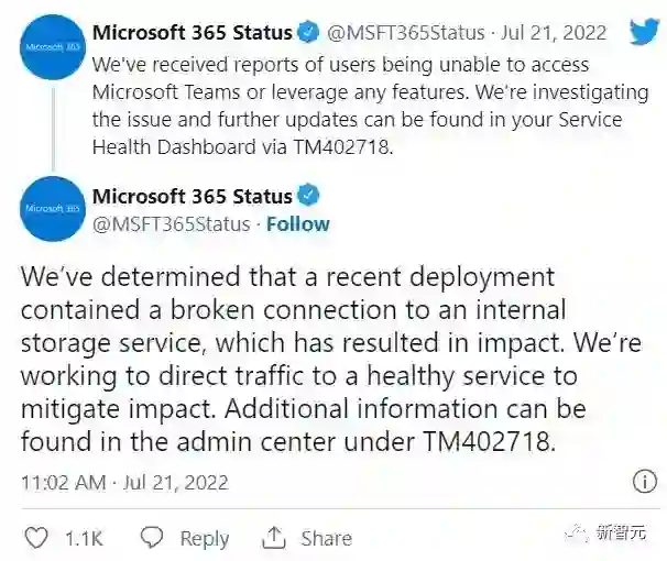 据悉,此次宕机事件的起因是微软公司在「最近的一次部署中出现了与内部存储服务的连接中断」。
