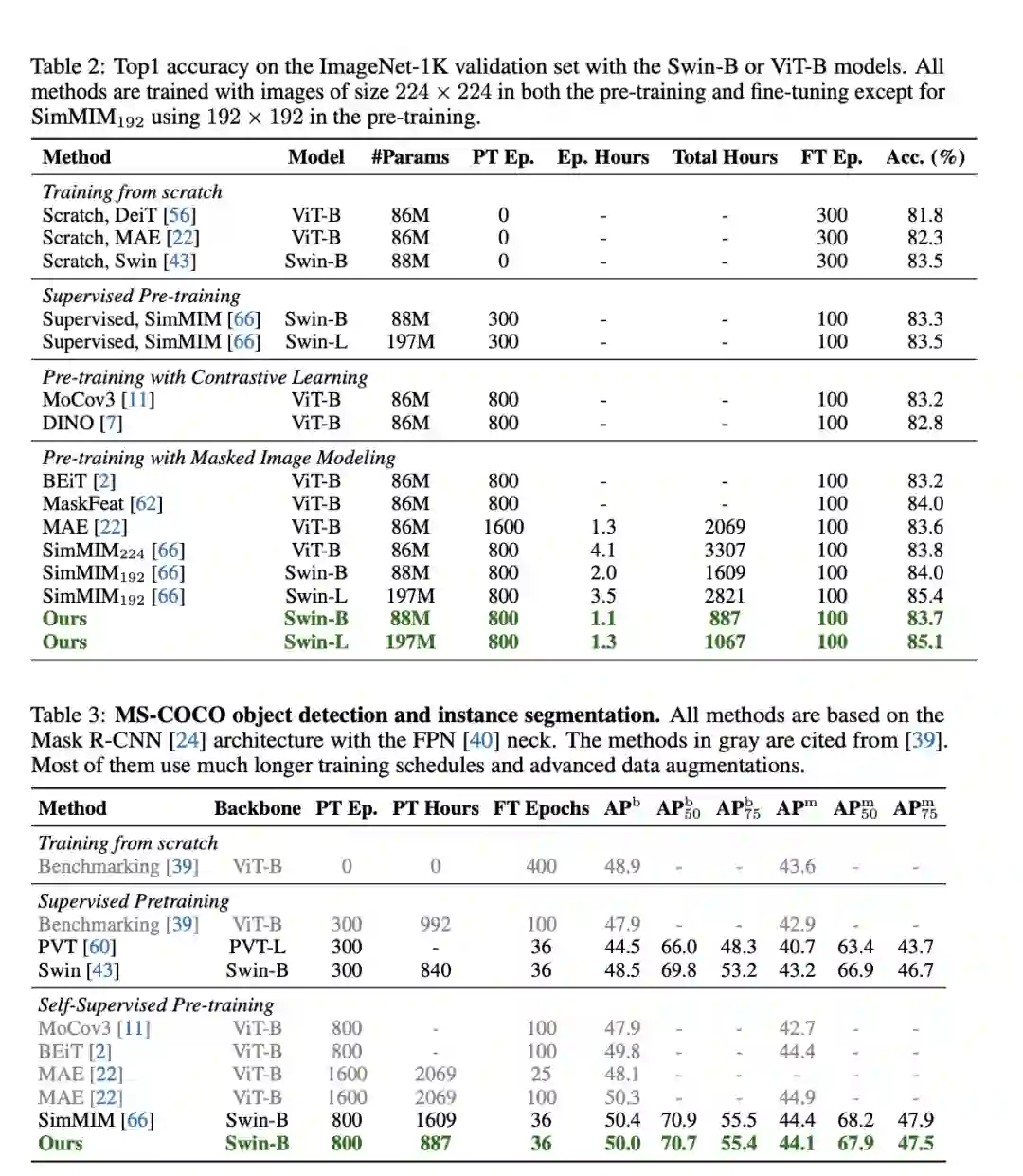 而跟SimMIM相比,这一方法在所需训练时间大大减少,消耗GPU内存也小得多。具体而言,在相同的训练次数下,在Swin-B上提高2倍的速度和减少60%的内存。