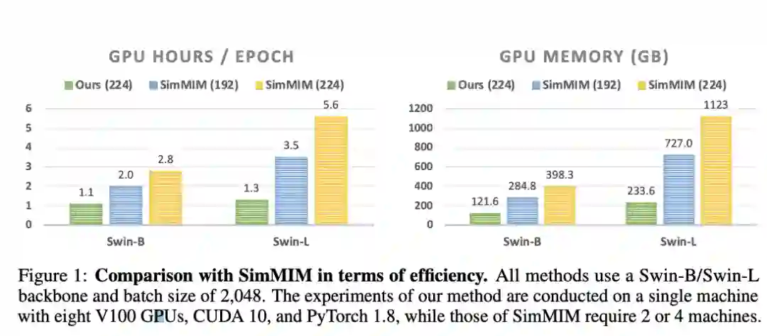 值得一提的是,该研究团队在有8个32GB V100 GPU的单机上进行评估的,而SimMIM是在2或4台机器上进行评估。