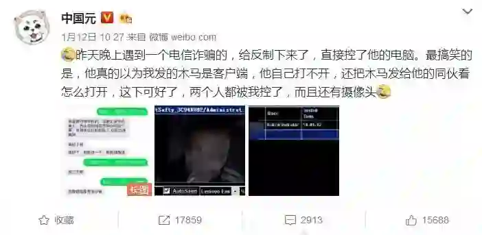 近日,微博互联网资讯博主@中国元 在网上分享了自己和电信诈骗犯斗智斗勇的全过程,不仅全身而退,还利用“黑科技”,将诈骗犯们抓个现行,并移交警方处理,让网友大赞机智。