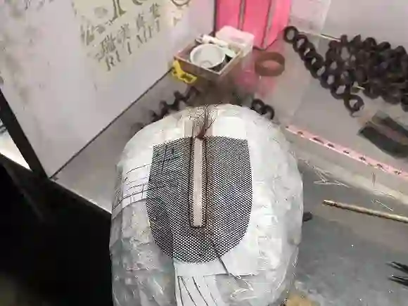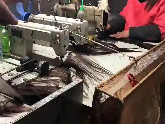 头发处理完之后,工作才进行到一半。工人需要将头发缝到发网上去,一种是机器像订书机一样缝上去,一种则是手织。