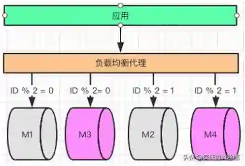 需要对目前的两个数据库做扩容,扩容之后是 4 个库如下图。新增的库是 M3,M4 路由的方式分别是 ID%2=0 和 ID%2=1。