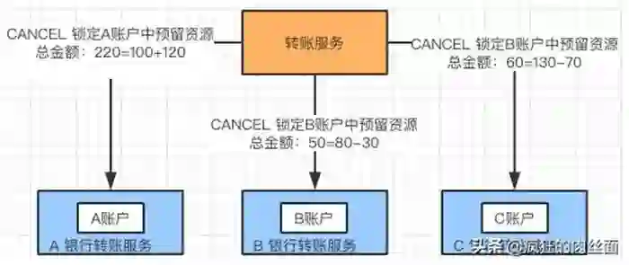 这里的交易数据库设计除了有金额字段,还要有转出金额或者转入金额的字段,在 Cancel 回滚的时候使用。