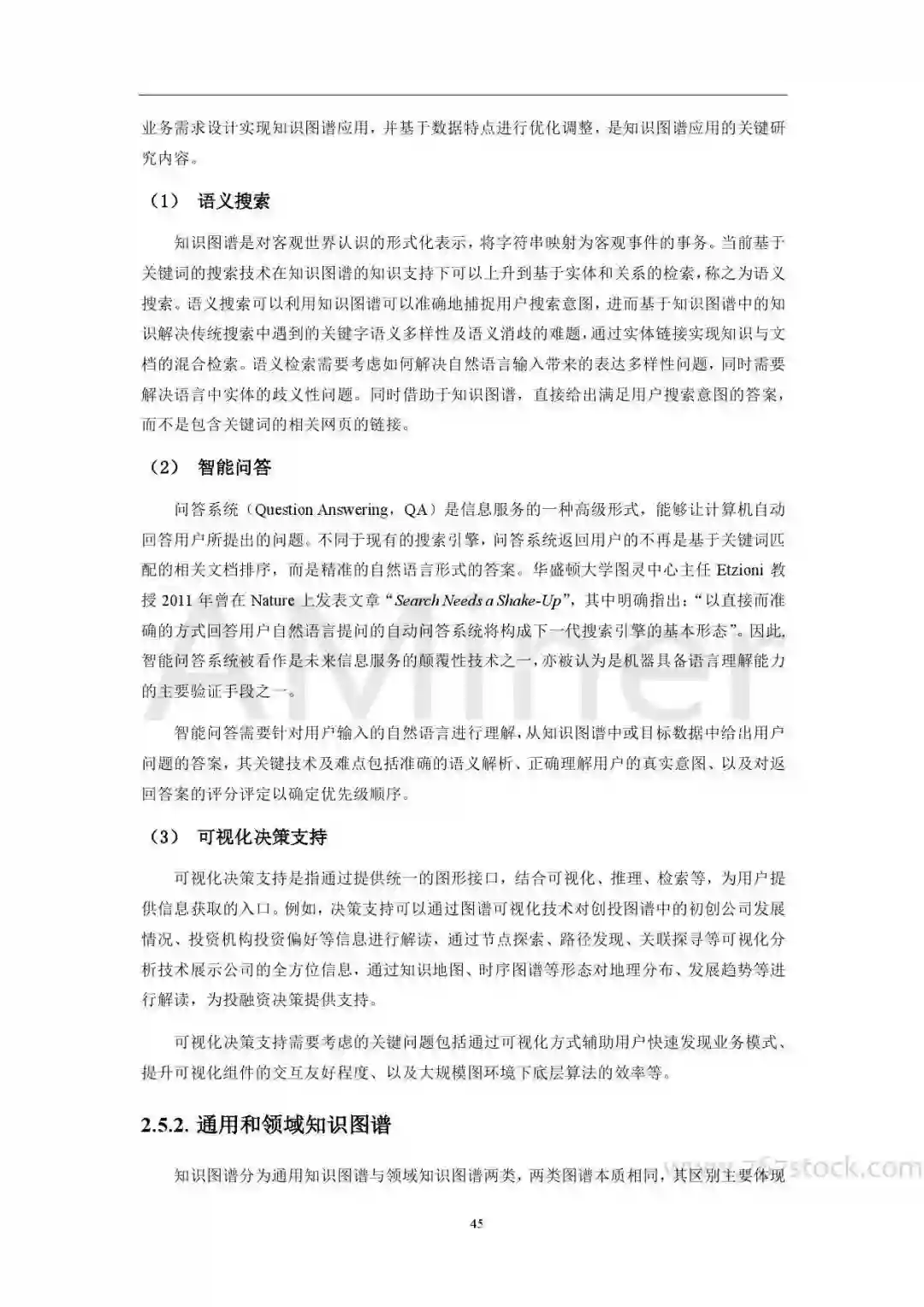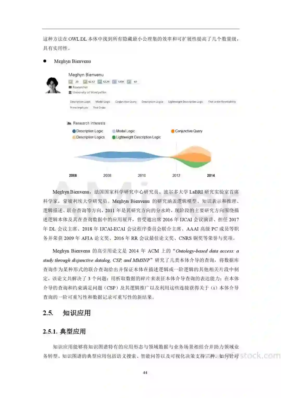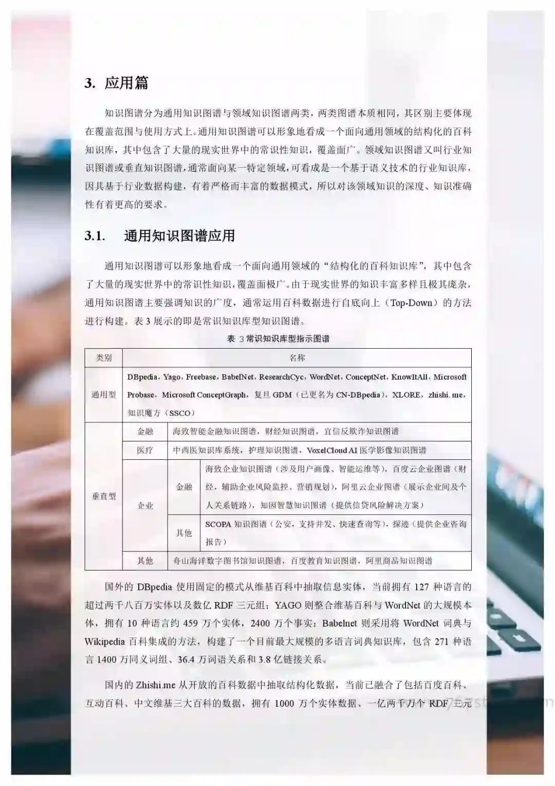 知识图谱应用。从通用知识图谱应用和领域知识图谱应用两个方面来介绍。以电子商务、图书情报、企业商业、船业投资、生物医疗五个领域,从图谱构建与知识应用两个方面介绍领域知识图谱的技术构建应用与研宄现状。