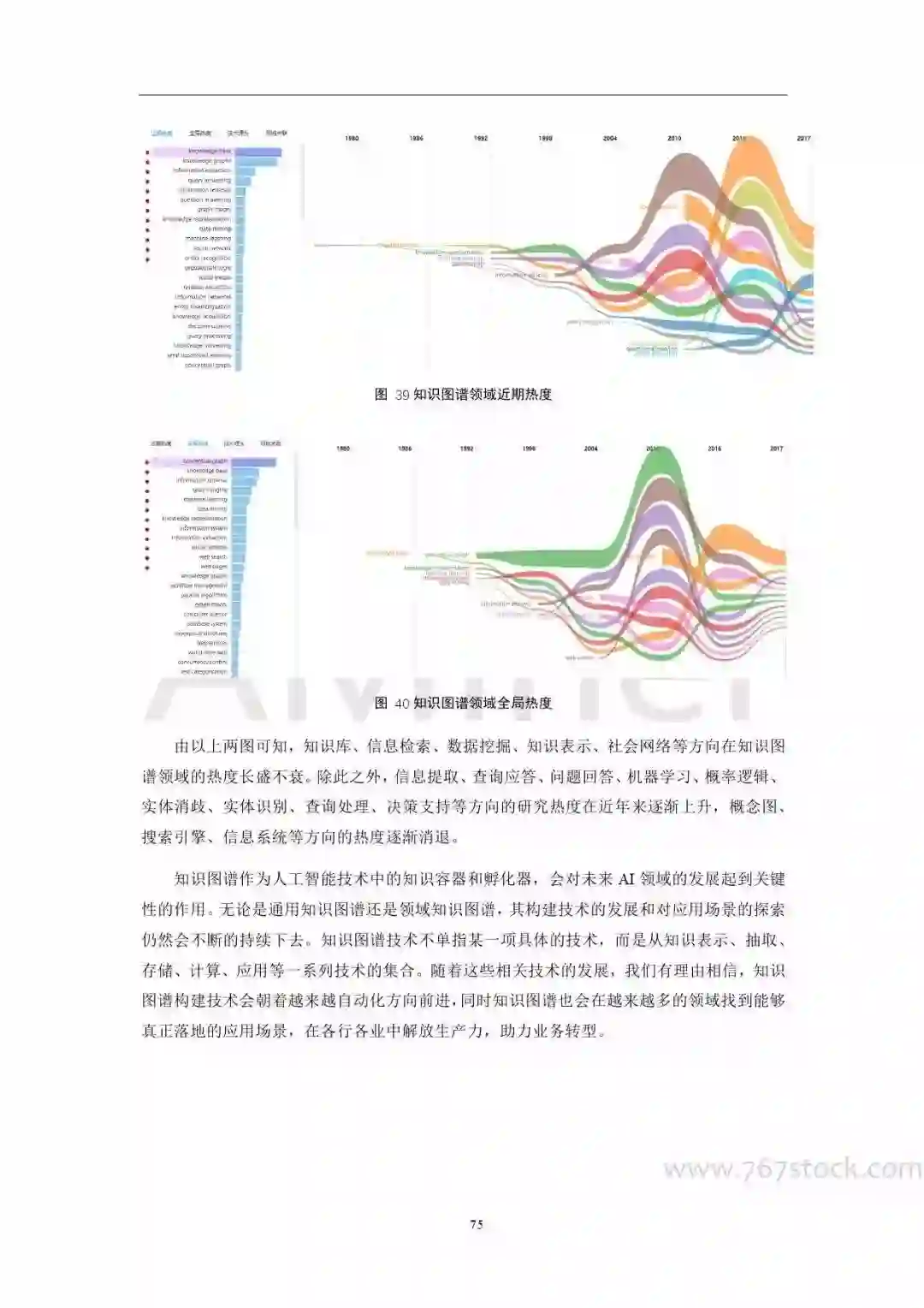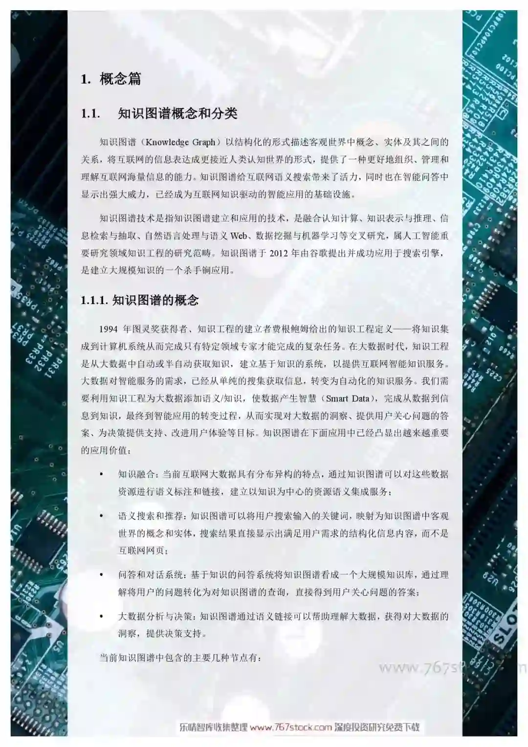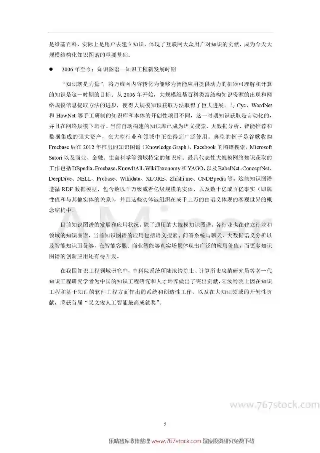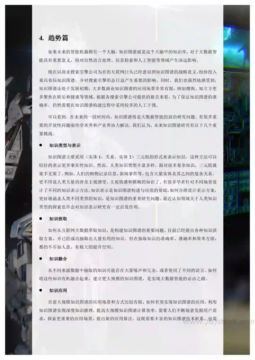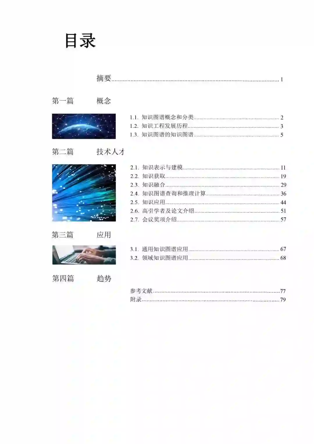 知识图谱技术。从知识表示与建模、知识获取、知识融合、知识图谱查询推理及知识图谱应用五个子领域来划分,并分别介绍每个领域所应用到的技术。