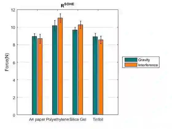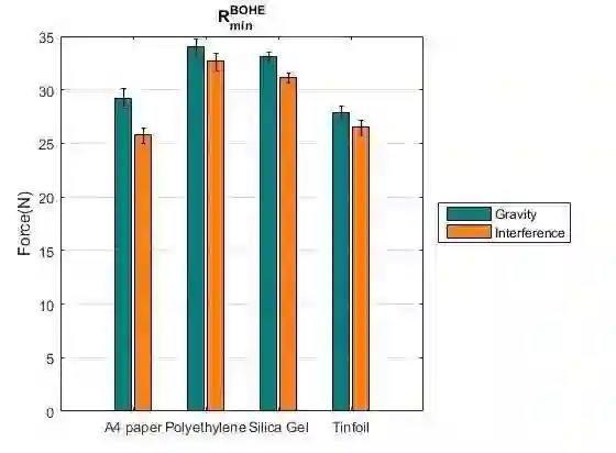 我们通过改变不同尺寸的物体表面材质来测量出对应的抓取模式下能够承受的最大干扰力。实验中一共使用了四种不同的表面材质,分别是普通打印纸质、聚乙烯塑料、硅胶以及锡纸。