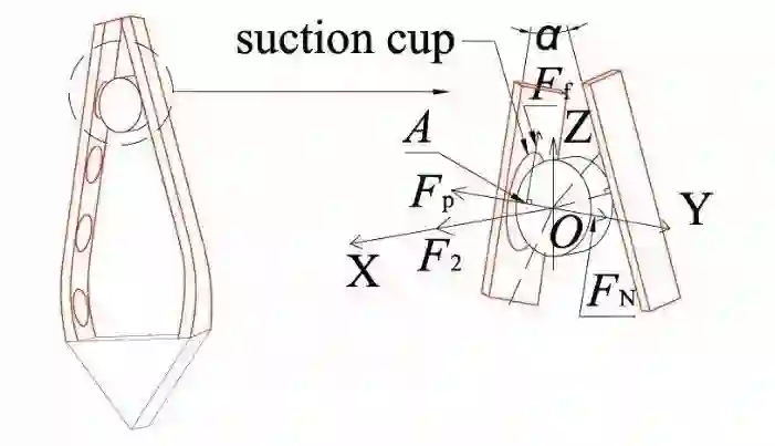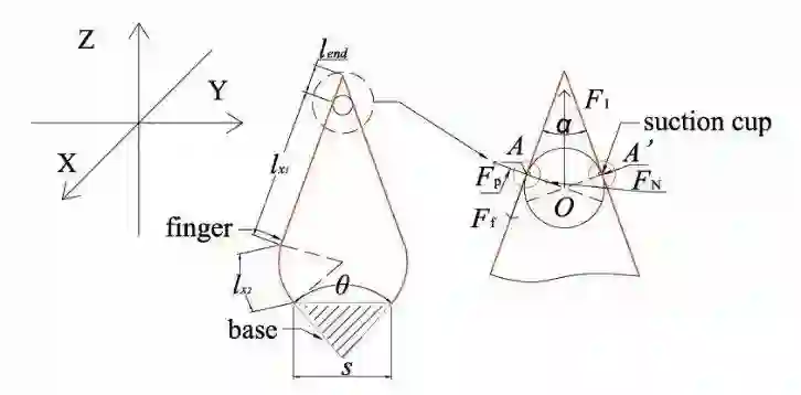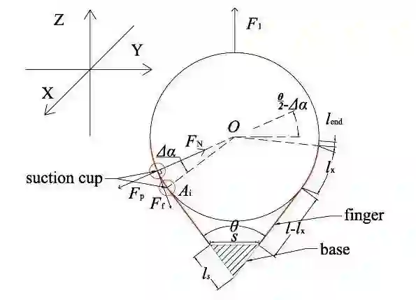 当手爪在抓取较大的物体时,手爪给物体施加的力中有一个分力使物体有远离手爪的趋势。如果,手爪通过特定的机制能够抵消这个分力的作用,从而使手爪能够牢牢的抓住物体。比如通过吸盘的吸力或者电磁力等等。我们称这种抓取模式为半包裹抓取(Half-enveloping)。我们通过实验发现,对于我们的手爪,除了在抓取较大物体时使用半包裹抓取模式,在抓取小尺寸的物体时也会呈现半包裹抓取的特性。以下,我们将从抓取大物体和抓取小物体两个方面进行定义和分析。简单起见,分析时假设物体都是圆柱。