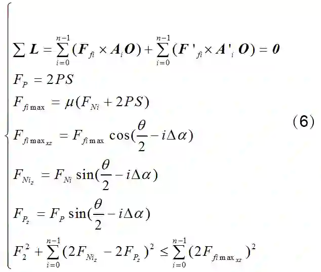在生活中经常会出现要抓取物体的尺寸比手爪的尺寸大的场景。就像图2(a)所示的抓足球一样。由于物体较大,手爪指根的运动会被物体所阻碍,此时只有指尖可以弯曲。在这种情况下,手爪在物体上接触点的连线时猎狐。并且如果此时只有抓紧力作用在手爪上的话,其中的一部分分力会使物体远离手爪。