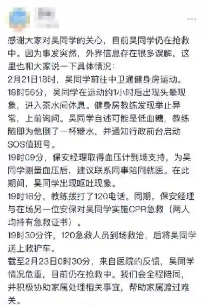 另有人表示,吴小伟是在健身房感到的身体不适。教练第一时间采取措施,后吴小伟被救护车拉走。