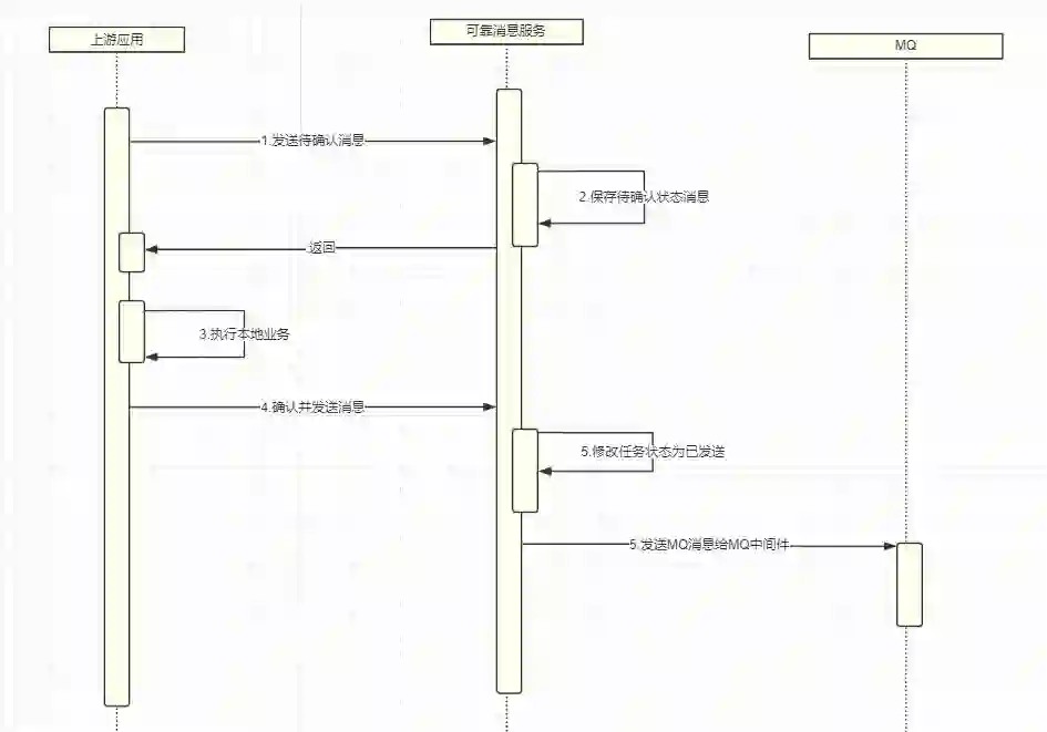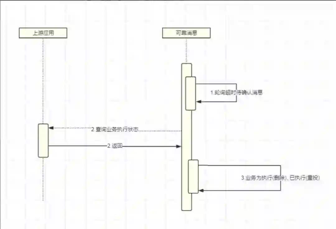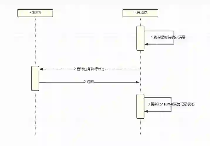 可靠消息则携带消息体内的信息向上游应用发起请求查询该业务是否已执行。上游应用提供一个可查询接口供可靠消息追溯业务执行状态,如果业务执行成功则更改消息状态为已发送,否则删除此消息确保数据一致。具体流程如下: