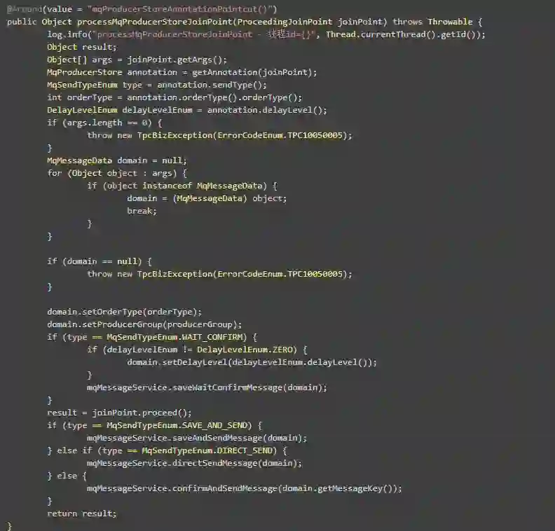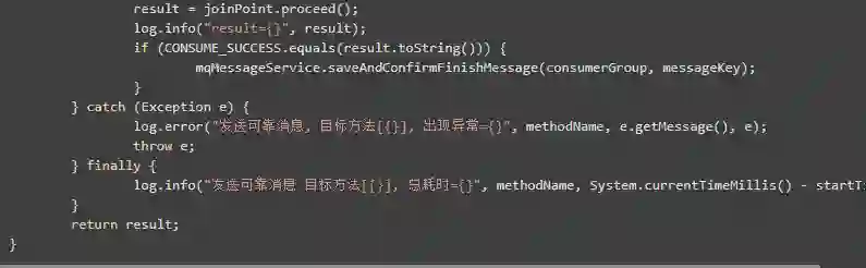 上游应用将本地业务执行和消息发送绑定在同一个本地事务中,保证要么本地操作成功并发送 MQ 消息,要么两步操作都失败并回滚。这里可以采用自定义切面完成,后续会有介绍。