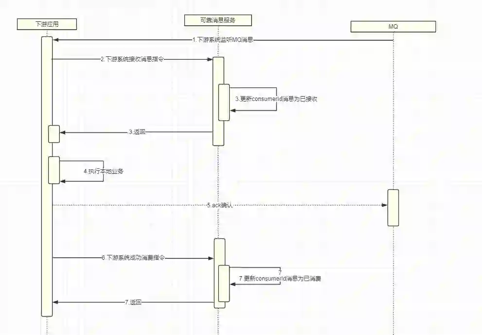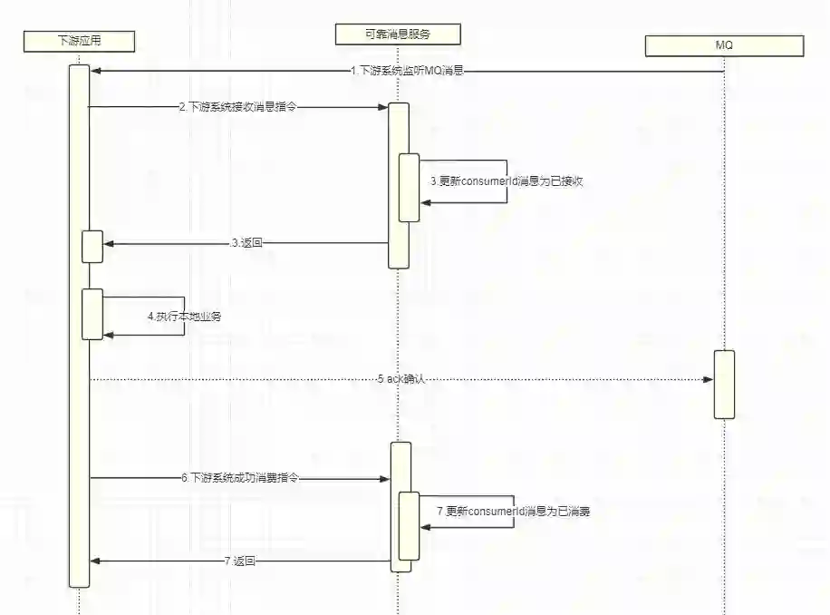 下游应用监听到此消息后,在保证幂等性的情况下重新执行业务并通知可靠消息服务此消息已经成功消费,最终确保上游应用、下游应用的数据最终一致性。具体流程如下:
