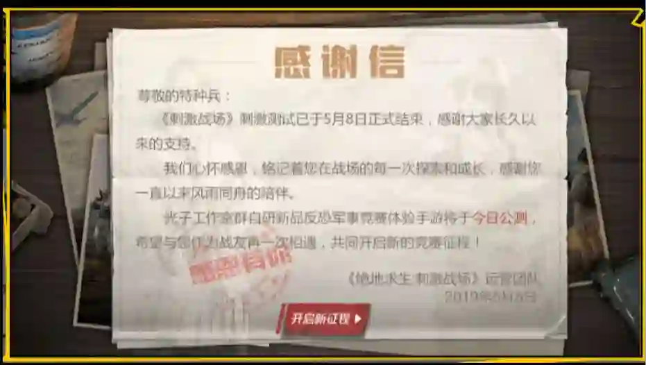 5月7日,一些玩家在登陆《绝地求生:刺激战场》后发现,游戏提示“体验服测试已结束”,而此后再登陆游戏,则会提示更新游戏。更新游戏实际上是下载腾讯旗下的另一款吃鸡类游戏《和平精英》,《绝地求生:刺激战场》似乎完成了它的历史使命,而以另一种形态得以重生。