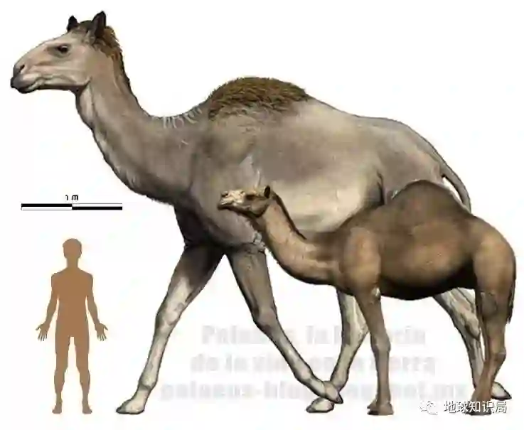 巨足驼与单峰驼和人类的体型对比