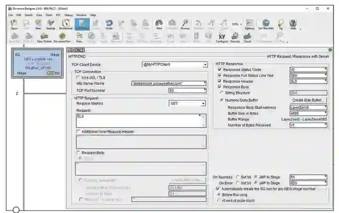 PLC 编程必须具有用于定义目标 API 服务器名称(URL)和其它详细信息的 HTTP 指令(图 3)。此配置包括请求字符串以及响应信息应放置的位置。
