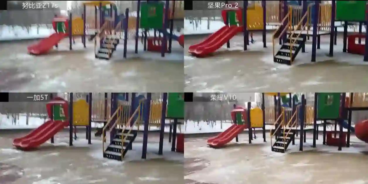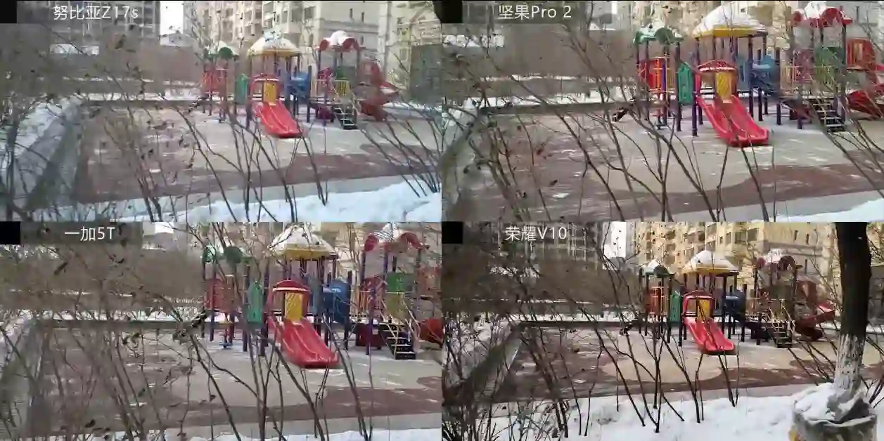 在白天的情况,努比亚在拍摄雪地的时候曝光和白平衡都不正常,其他三台机器看起来好很多。稳定性的测试,由于努比亚和荣耀V10都没有电子防抖,画面一动起来都是颤颤悠悠的。坚果Pro2和一加5T的电子防抖能够抵消大部分的抖动,实际效果比较平滑稳定。但是画面裁切比较明显。