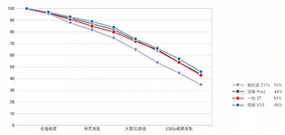 剩余40%的一加5T比Z17s稍好,电池容量的提升还是最直接的办法,配合DASH闪充,一定程度淡化续航的影响。V10和坚果Pro 2不用多说,稳稳的抢到头牌。
