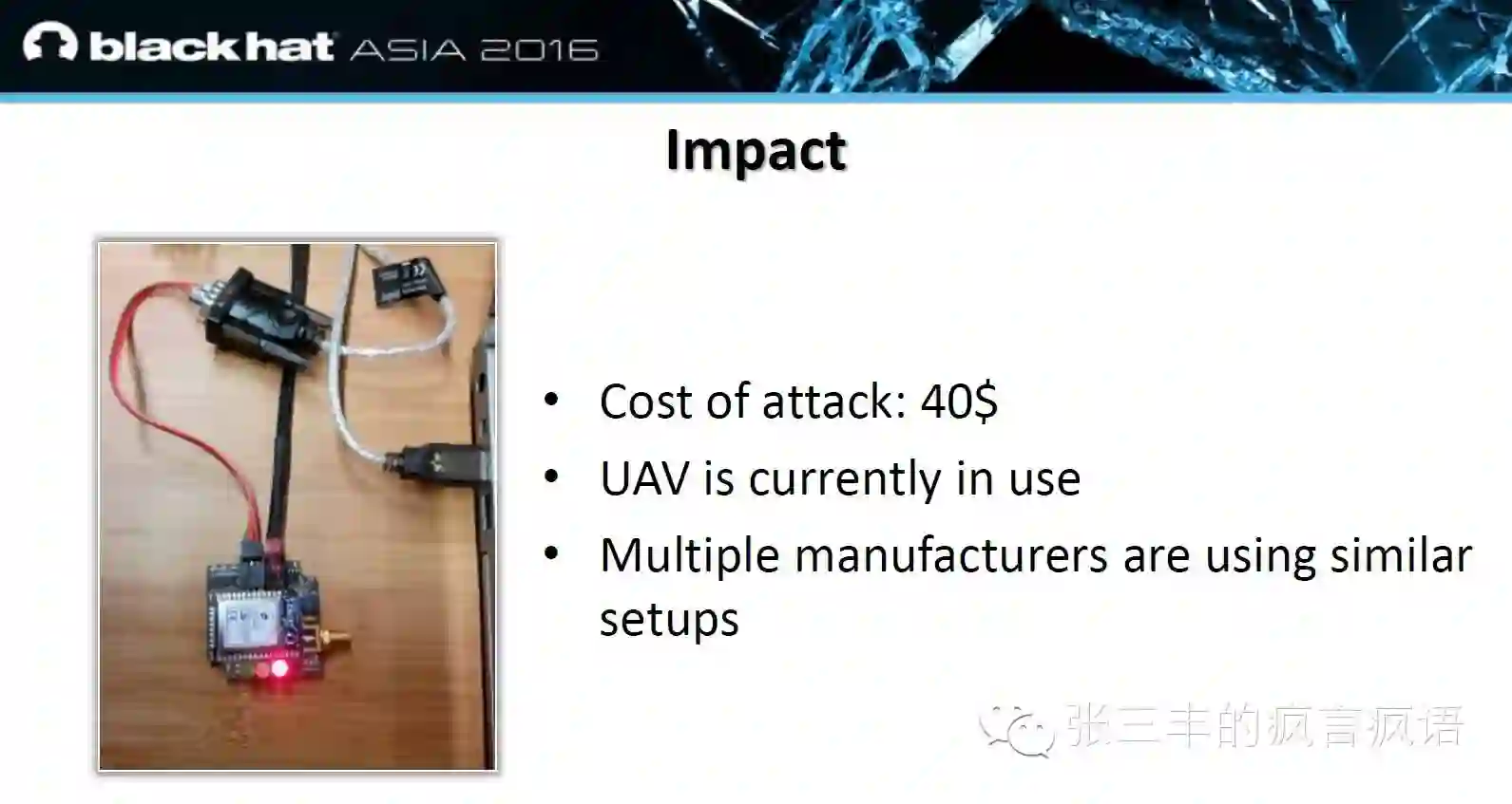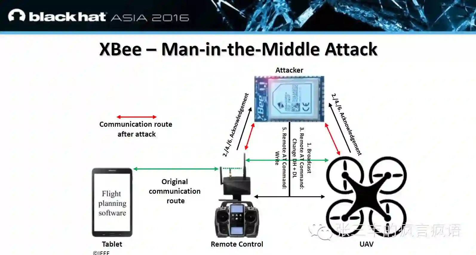 除了常见的破解手机客户端与控制器直接的WIFI连接。更主要是演示了通过攻击无人机与控制器之间通信的Xbee模块(XBee是美国MaxStream公司基于ZigBee技术的一个无线传输模块)而完成无人机的劫持。攻击这么容易是因为无人机中Xbee芯片并没有加密通信的内容。
