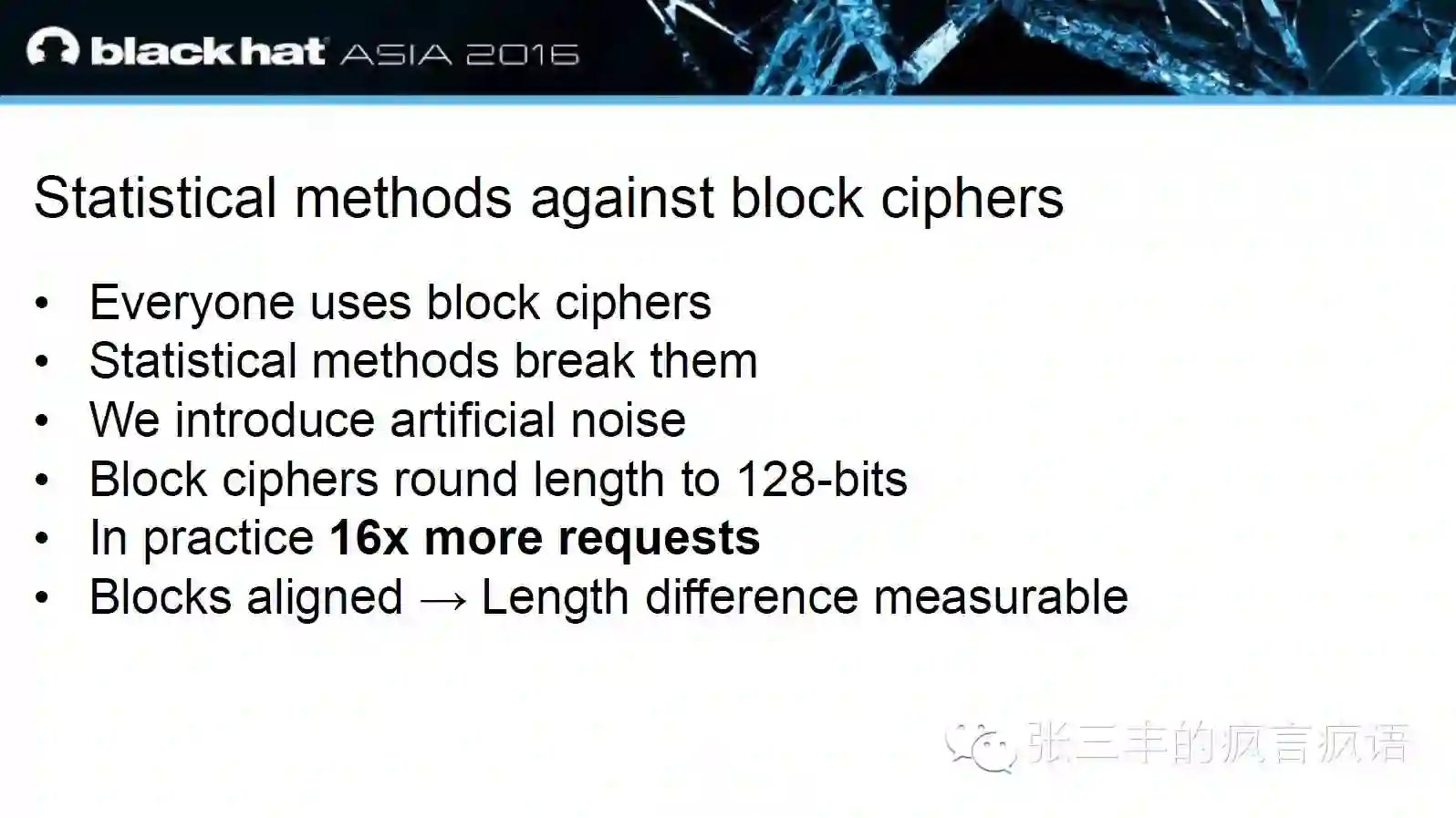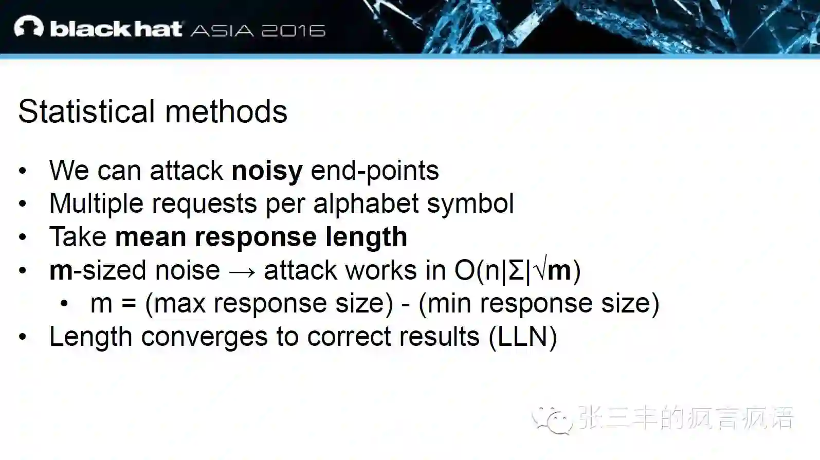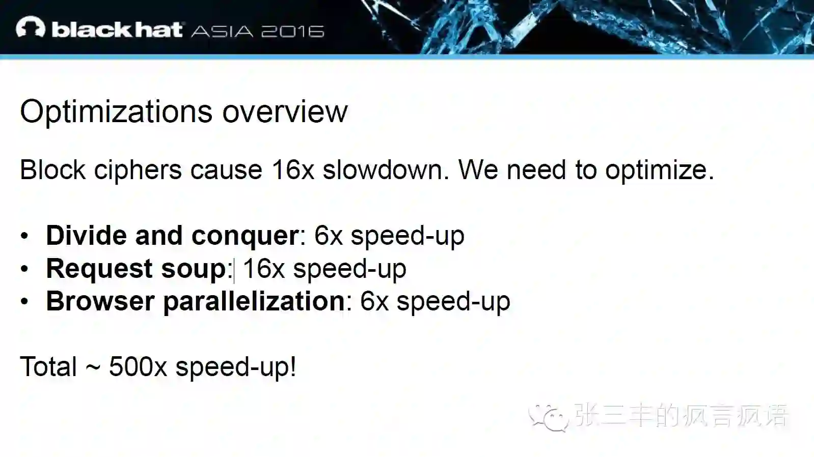 使用了统计的方法对BREACH进行了改进。由于分组密码造成16倍的攻击速度放缓,需要进行优化,从三个方面对攻击进行了优化,据称速度提高了500+倍。