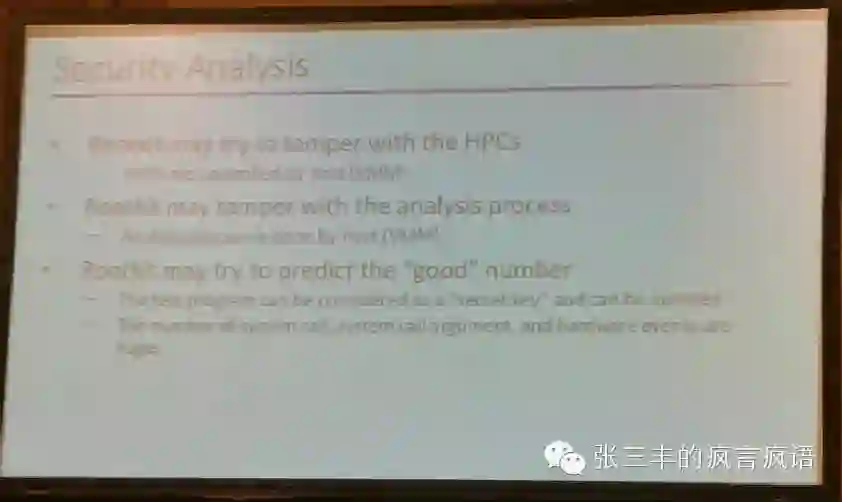 演讲者展示了目前流行的内核级Rootkit的检测结果,100%准确率。