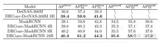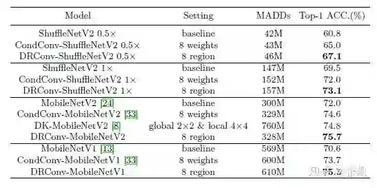 在分类任务上,采用DRConv在不同的模型上,性能有较为显著的提升,而计算量只增加了部分。