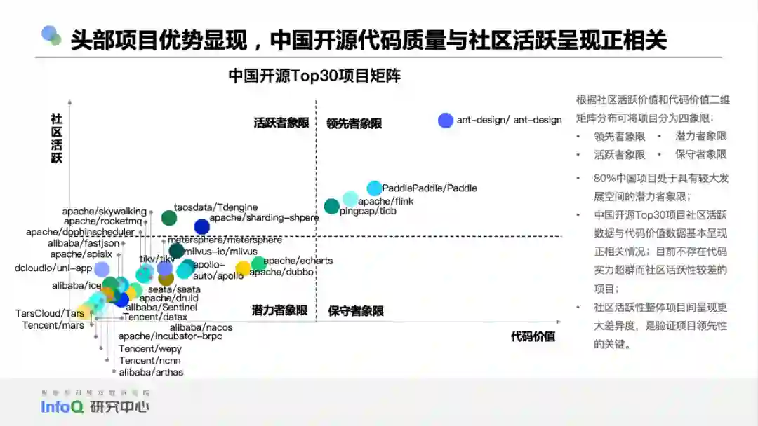 通过模型, 我们计算出了社区活跃 Top 10 项目、代码价值 Top 10 项目和中国开源项目 Top 30。值得注意的是,中国 Top 级开源项目与国际顶级开源项目仍存在较大差异, 如果采用相同的算法, 国际 Top 10 项目的平均分是国内 Top 10 项目平均分的 4.78 倍,中国开源仍然任重而道远。