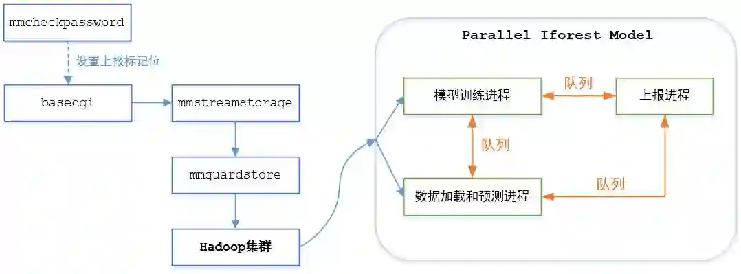 模型训练进程定期训练最新的模型,并把模型通过队列传给预测进程。预测进程每分钟运行一次,检查模型队列上是否有新模型可使用,然后加载数据、检测异常,将检测结果通过上报队列传给上报进程。上报进程block在上报队列上,一旦发现有新数据,就根据数据类型执行上报监控、上报tdw等操作。