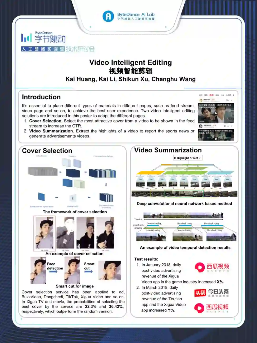 有数学还不够,你需要把它做成产品,所以你可以先看看 AI Lab 做出来的 Demo。其实它们很多都已经应用到实际产品中,例如 2018 年世界杯期间接入了今日头条直播间的视频分析、接入抖音的视频内容审核、嵌入西瓜视频的封面生成等,不过这里只重点介绍了视频理解与背景虚化两种应用。