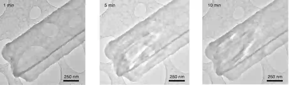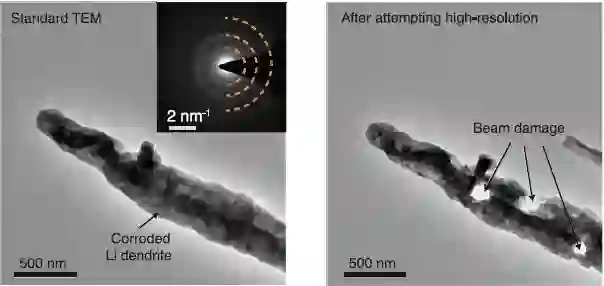 众所周知,锂金属枝晶和固体-电解质界面 (SEI) 是困扰锂电池发展的两大问题,但其生长方式与结构并不清楚。因为锂金属活性强,在空气和电子辐射下都不太稳定,传统的透视电镜很难用于其精细结构研究。这从下图可以看出,在传统的透视电镜下,锂枝晶已经被腐蚀而显得表面粗糙,而且电子辐射下出现严重的破坏。