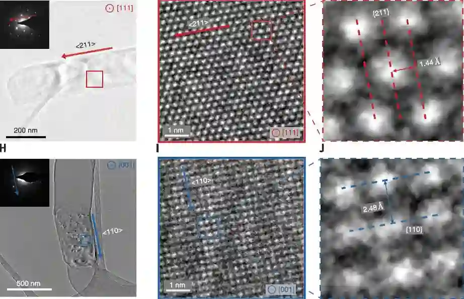 此外,他们还发现枝晶生长过程中可能拐弯,出现拐角,而且拐角处不存在缺陷。这与其他类型的单晶纳米线生长略有不同。