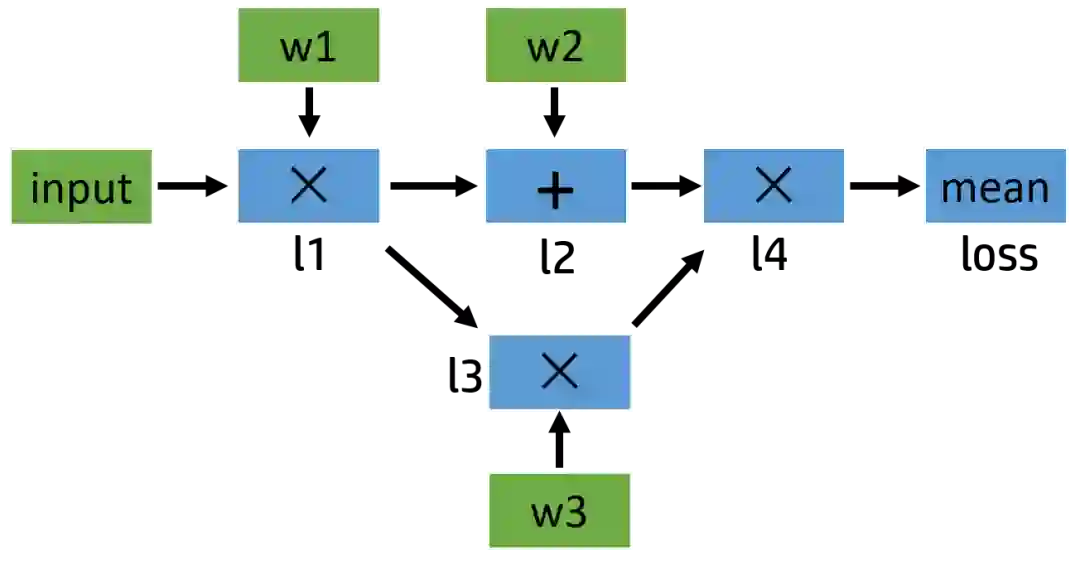 下面给出了对应的代码,我们定义了input,w1,w2,w3 这三个变量,其中 input 不需要求导结果。根据 PyTorch 默认的求导规则,对于 l1 来说,因为有一个输入需要求导(也就是 w1 需要),所以它自己默认也需要求导,即 requires_grad=True(如果对这个规则不熟悉,欢迎参考 我上一篇博文的第一部分 或者直接查看 官方 Tutorial 相关部分)。在整张计算图中,只有 input 一个变量是 requires_grad=False 的。正向传播过程的具体代码如下: