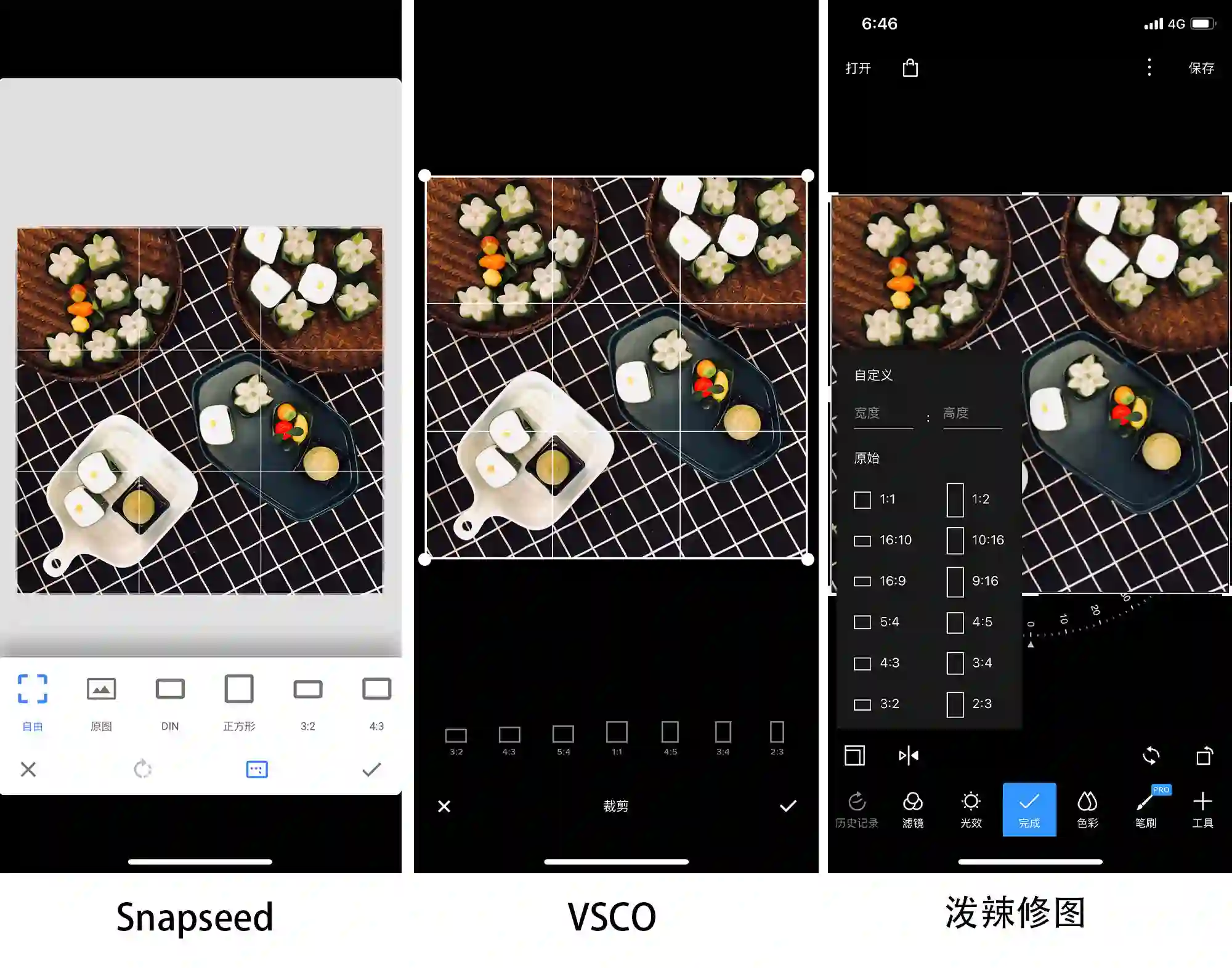 这个时候,二次构图就可以让我们重新选择。二次构图不仅仅能够解决画面内容的重新放置,还能给我们更多的框选方式。例如以下几个应用中提供的画面比例: