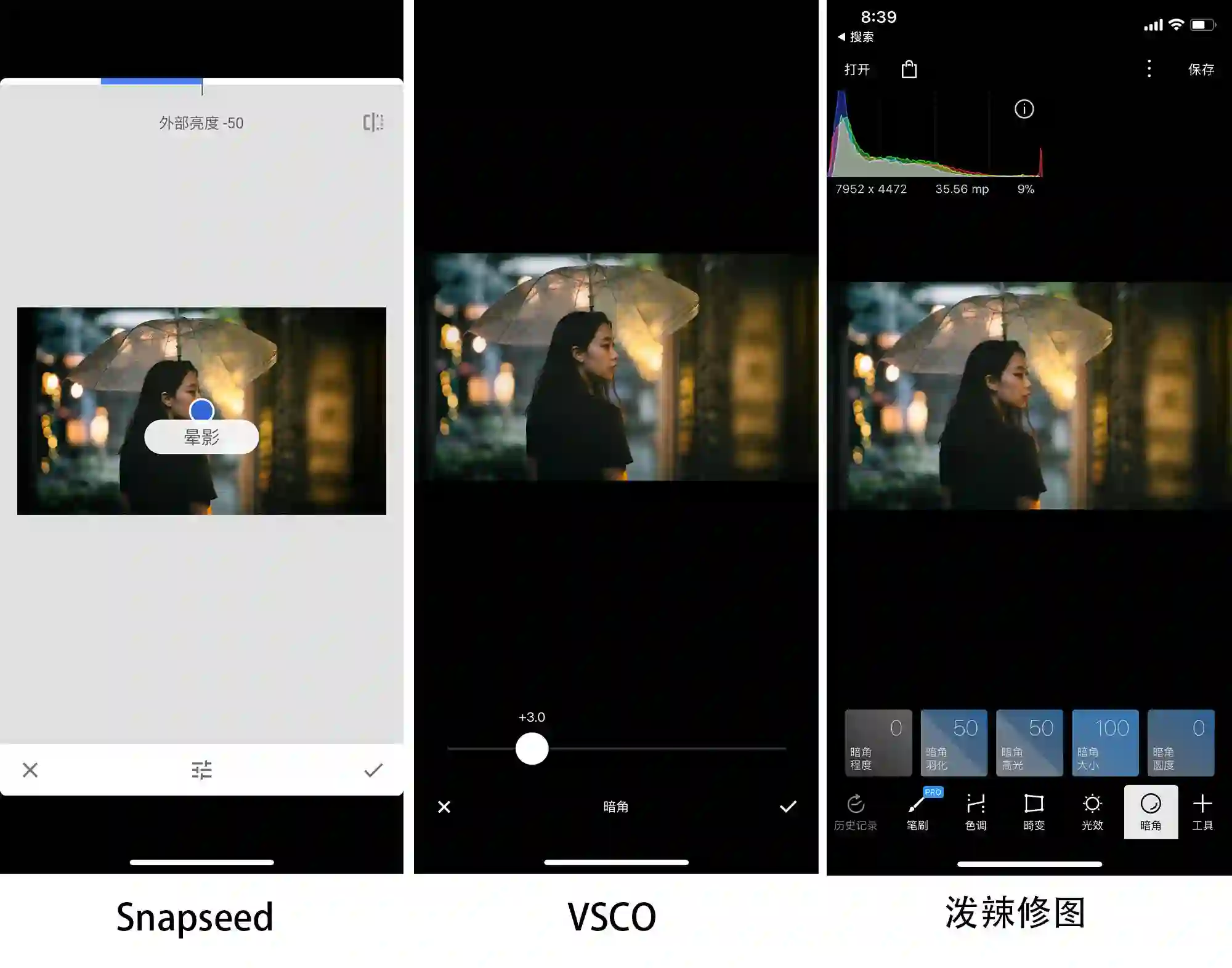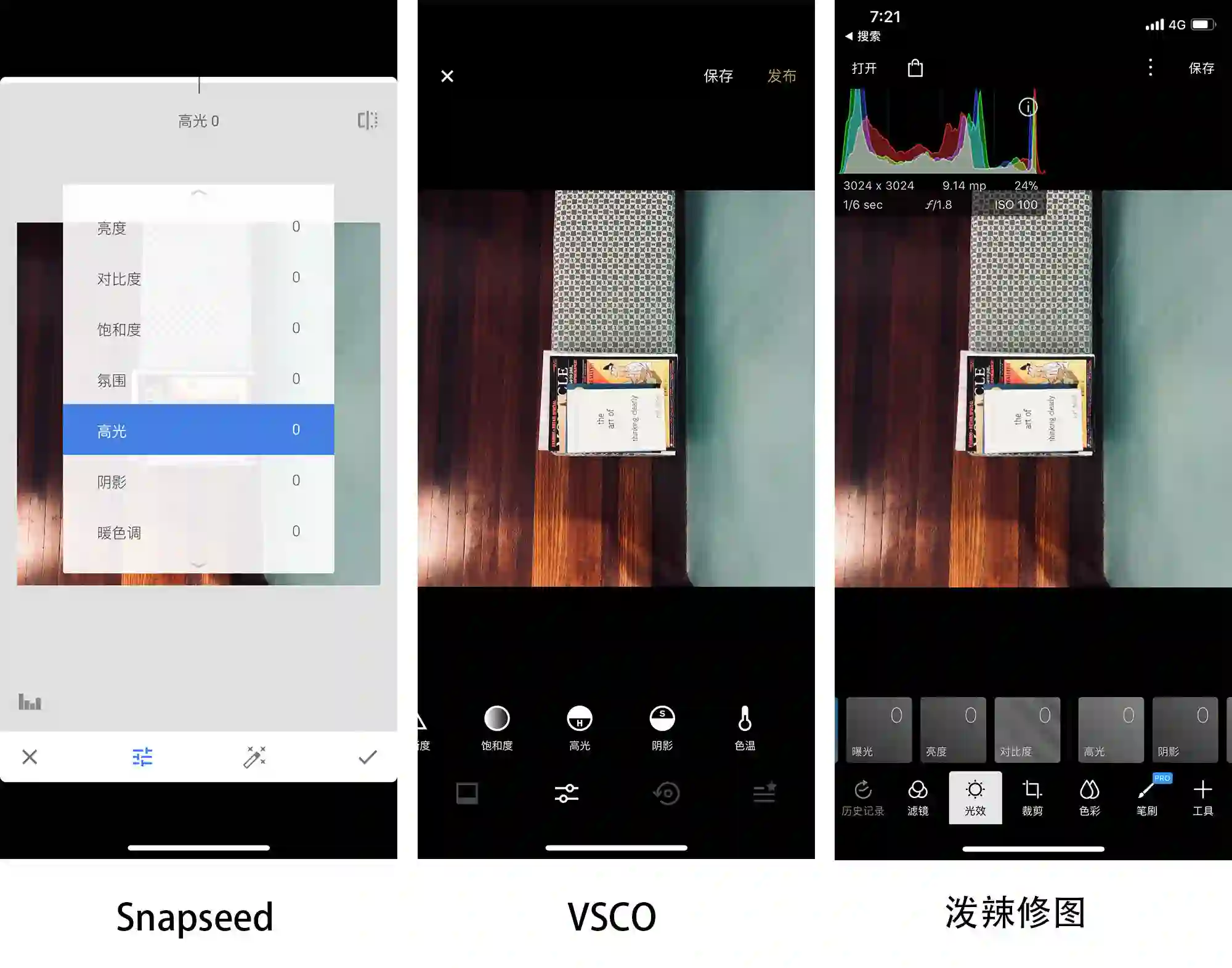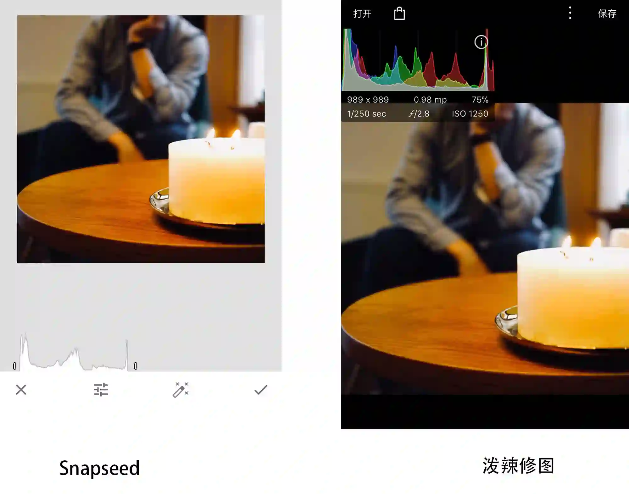 在 Snapseed 和 泼辣修图 中都有直方图的显示: