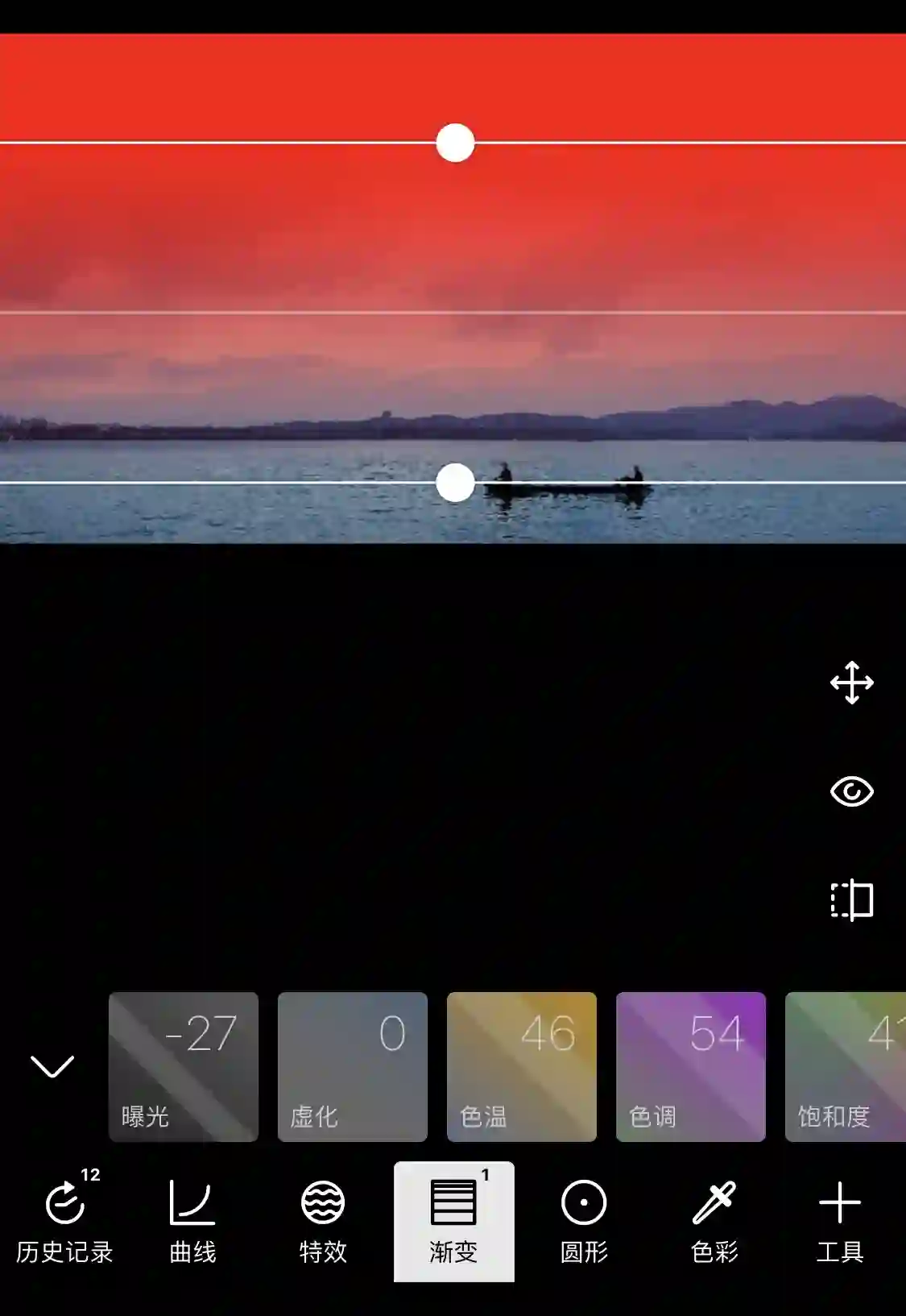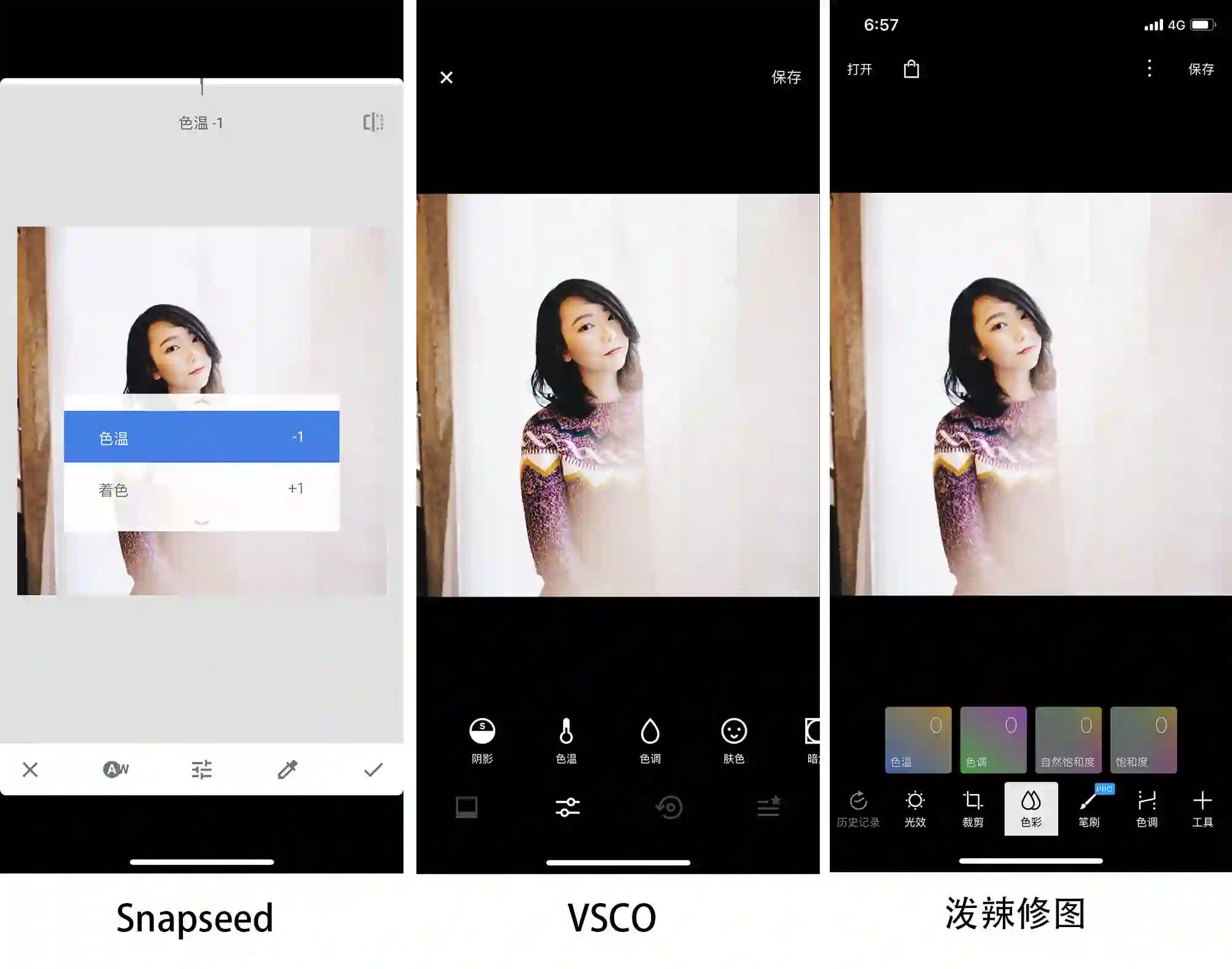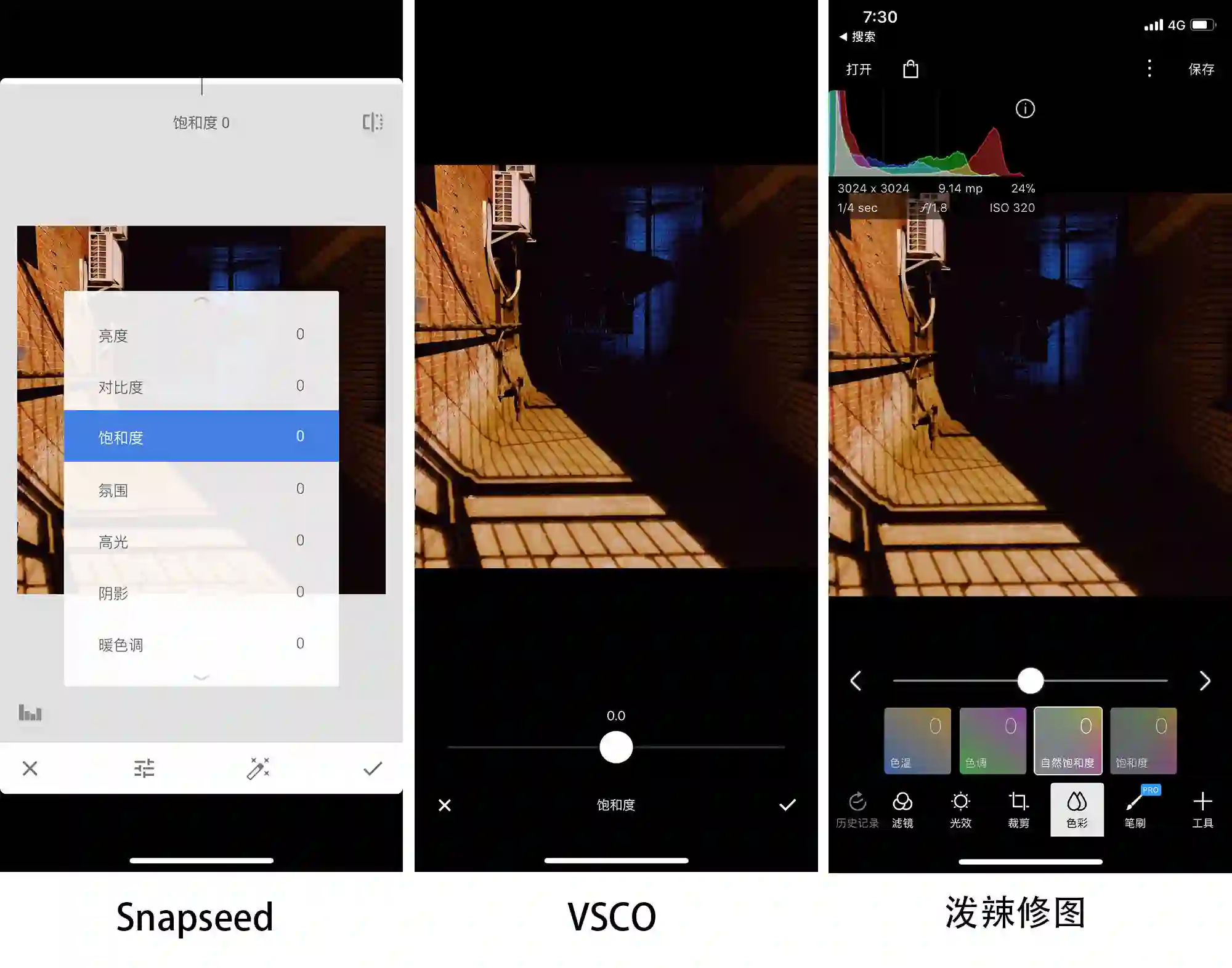 在 Snapseed 和 泼辣修图 中都有直方图的显示: