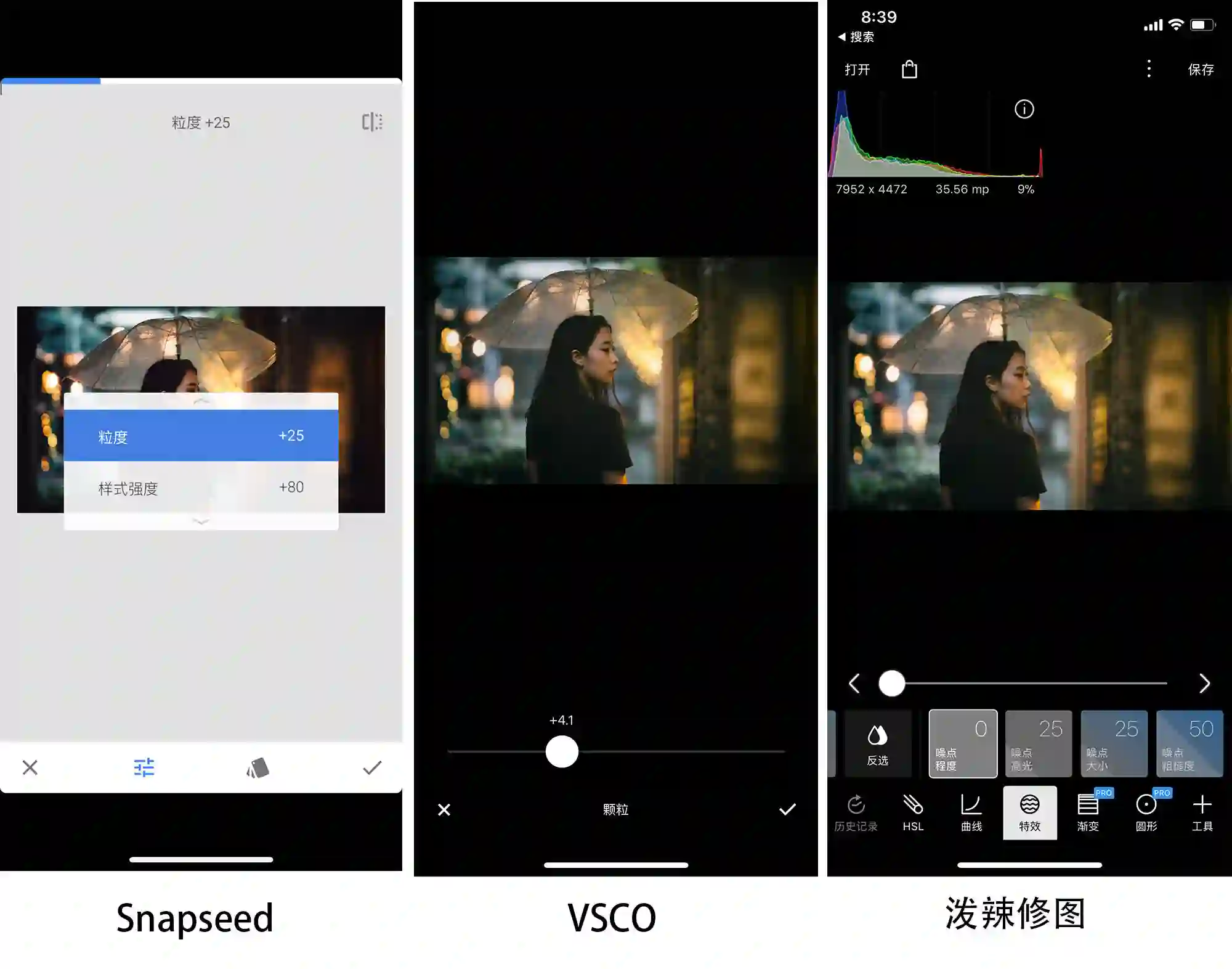 需要说明的是,颗粒这个功能一定要谨慎之用,过度使用很容易造成照片的视觉模糊。