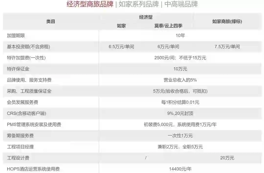 硬件达标之后是资金条件。以100间房的酒店为例,如家的加盟费在25万左右,押金10万,再加上酒店管理系统安装费等,基本投入大概需要40万。